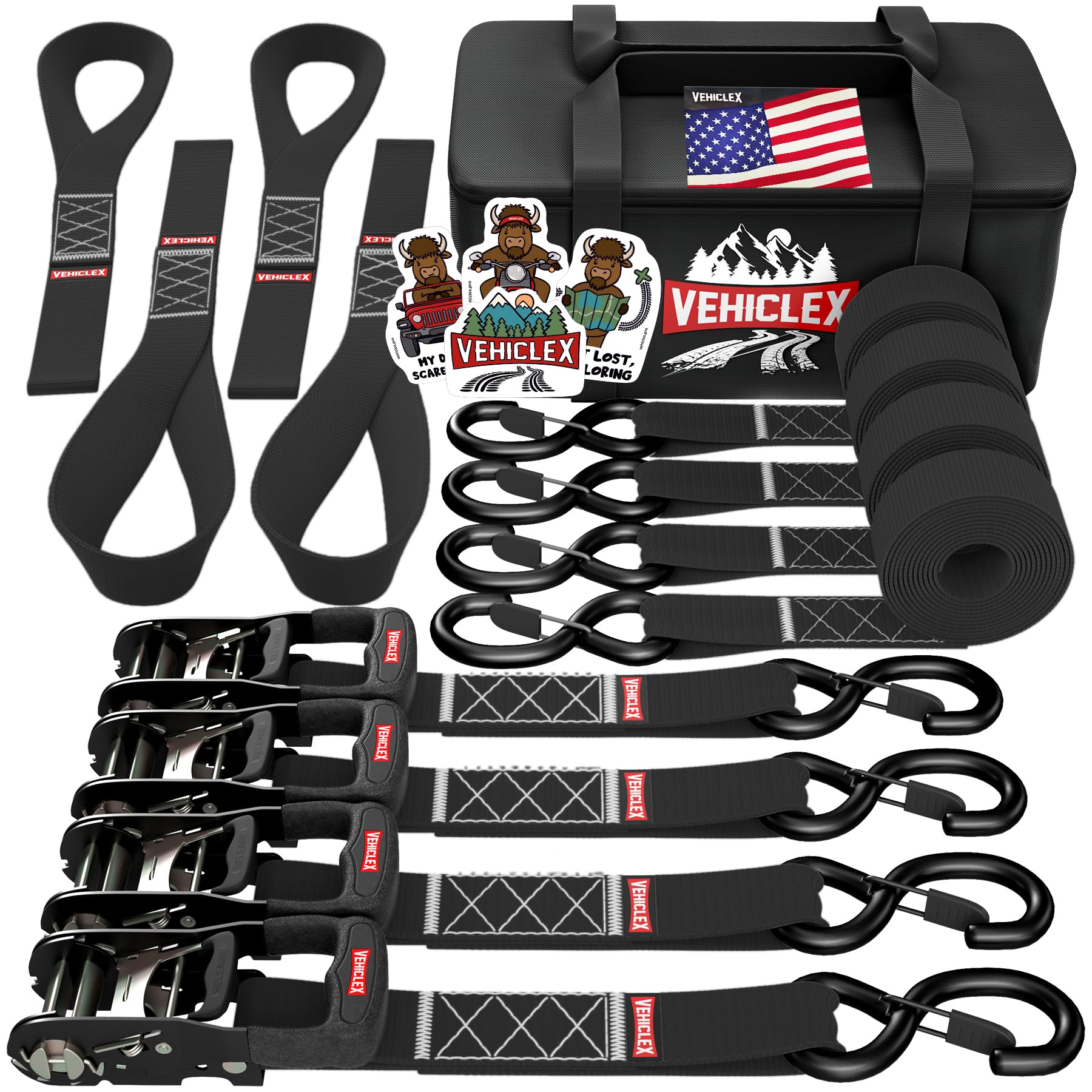 Vehiclex Correas de amarre de trinquete para motocicleta con bucles suaves, kit de 4 unidades de alta resistencia de 1.5 pulgadas