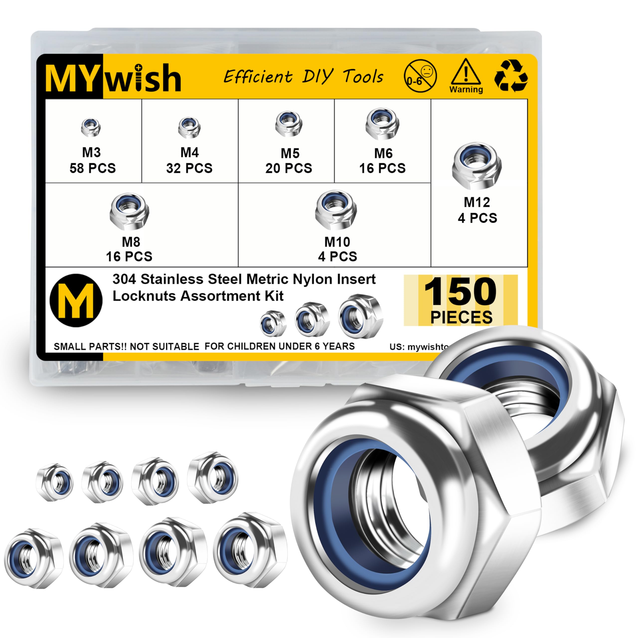 Mywish 150 tuercas de bloqueo M3 M4 M5, M6 M8 M10 M12, kit surtido de tuercas métricas, juegos de bloqueo de inserción de nailon,