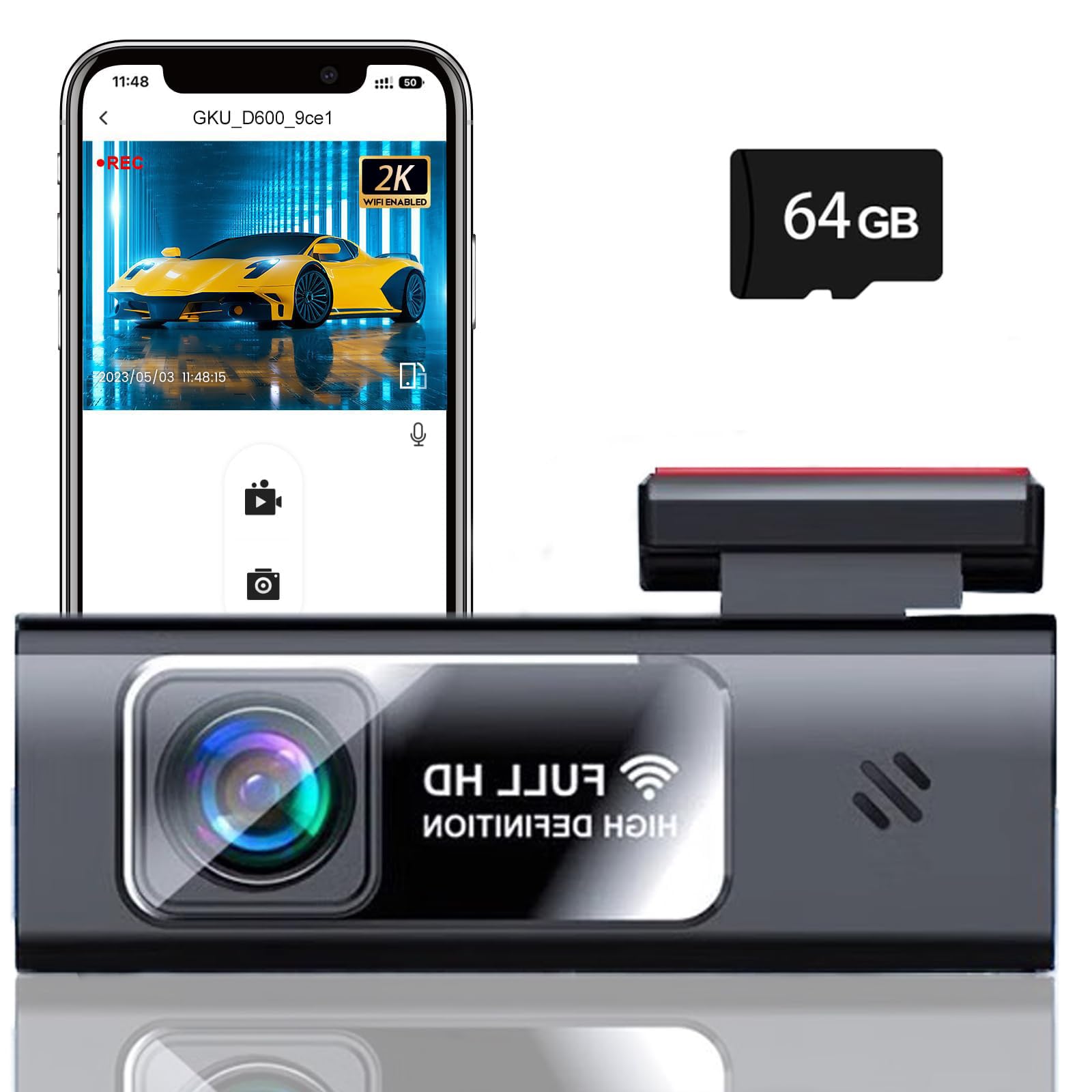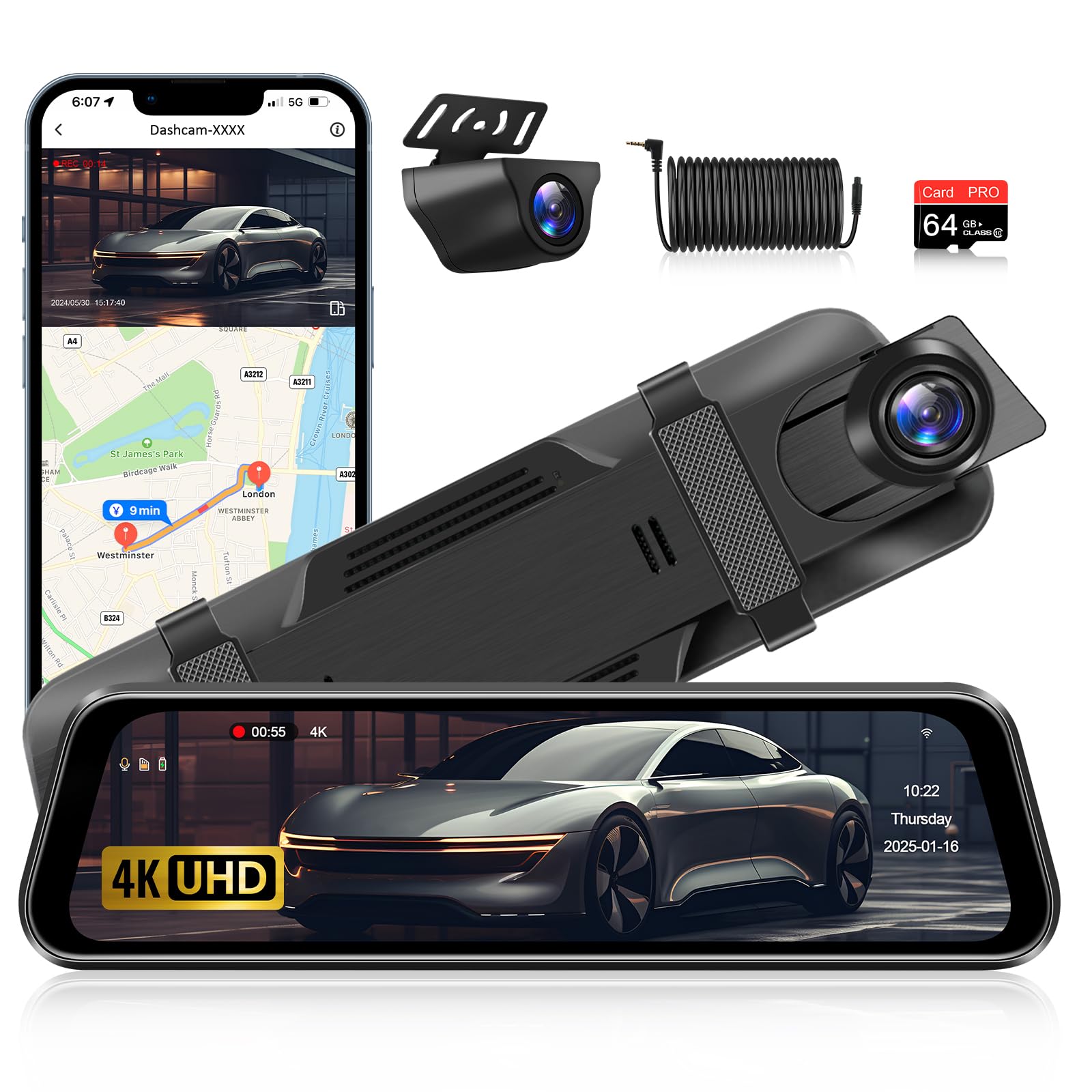 Kingslim Cámara de tablero 4K delantera y trasera con tarjeta SD de 64 GB, cámara WiFi 5G para coches, pantalla de 1.5 pulgadas, c