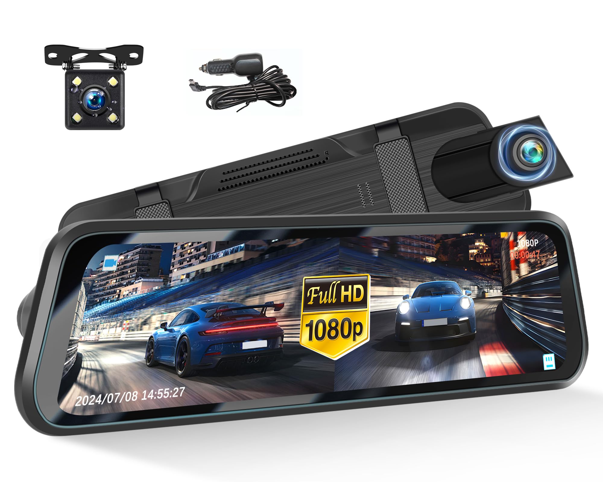 Espejo de 10 pulgadas, visión nocturna, 1080P FHD pantalla táctil completa frontal y trasera, cámara de respaldo para coches, grab