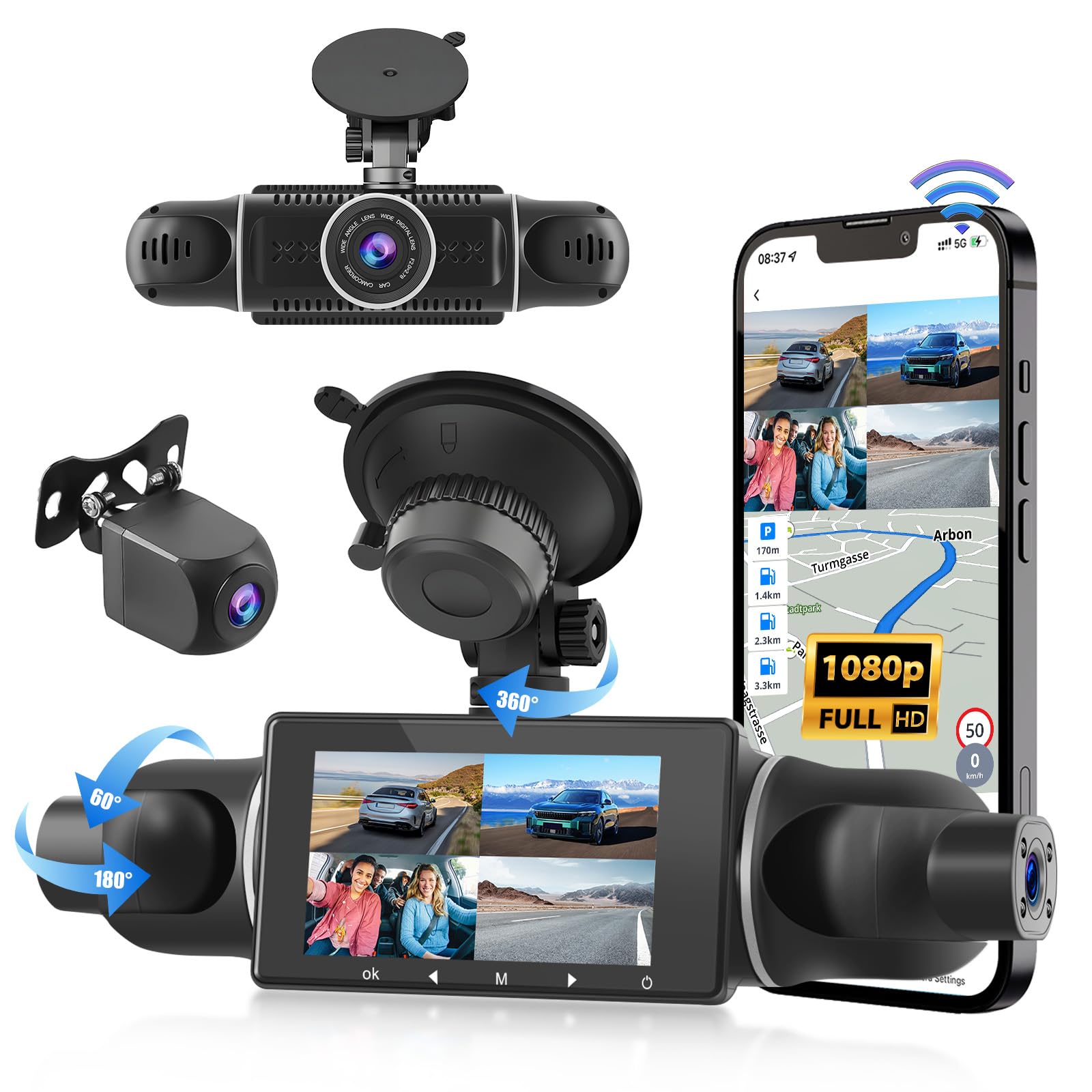 Hikity Cámara de tablero de 4 canales de 3 pulgadas para automóvil, visión de 360° frontal y trasera interior 1080P cámara con WiF
