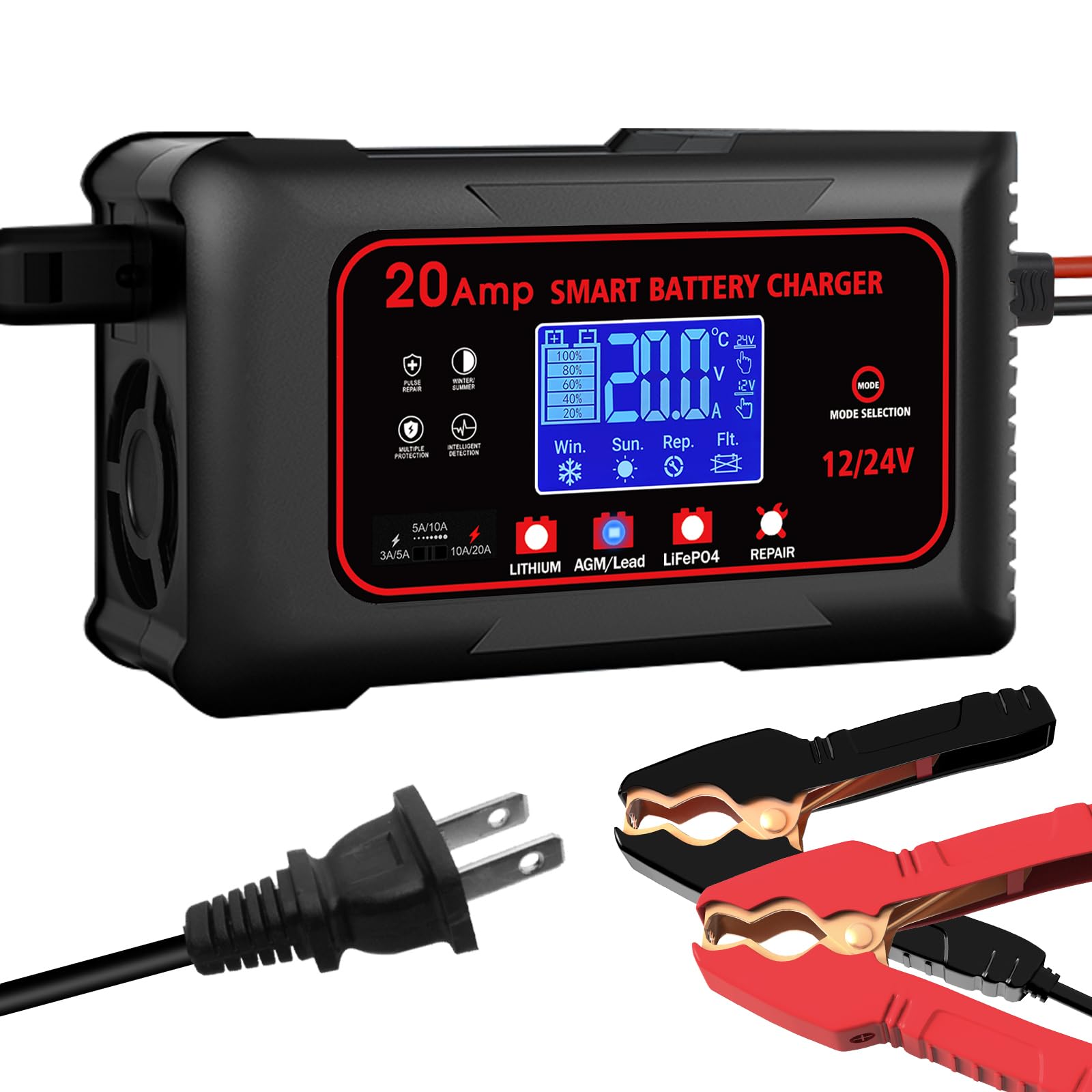 Cargador de batería de 20 amperios, 12 V, 20 A y 24 V, 10 A, LiFePo4, cargador de batería inteligente de plomo y ácido, mantenedor