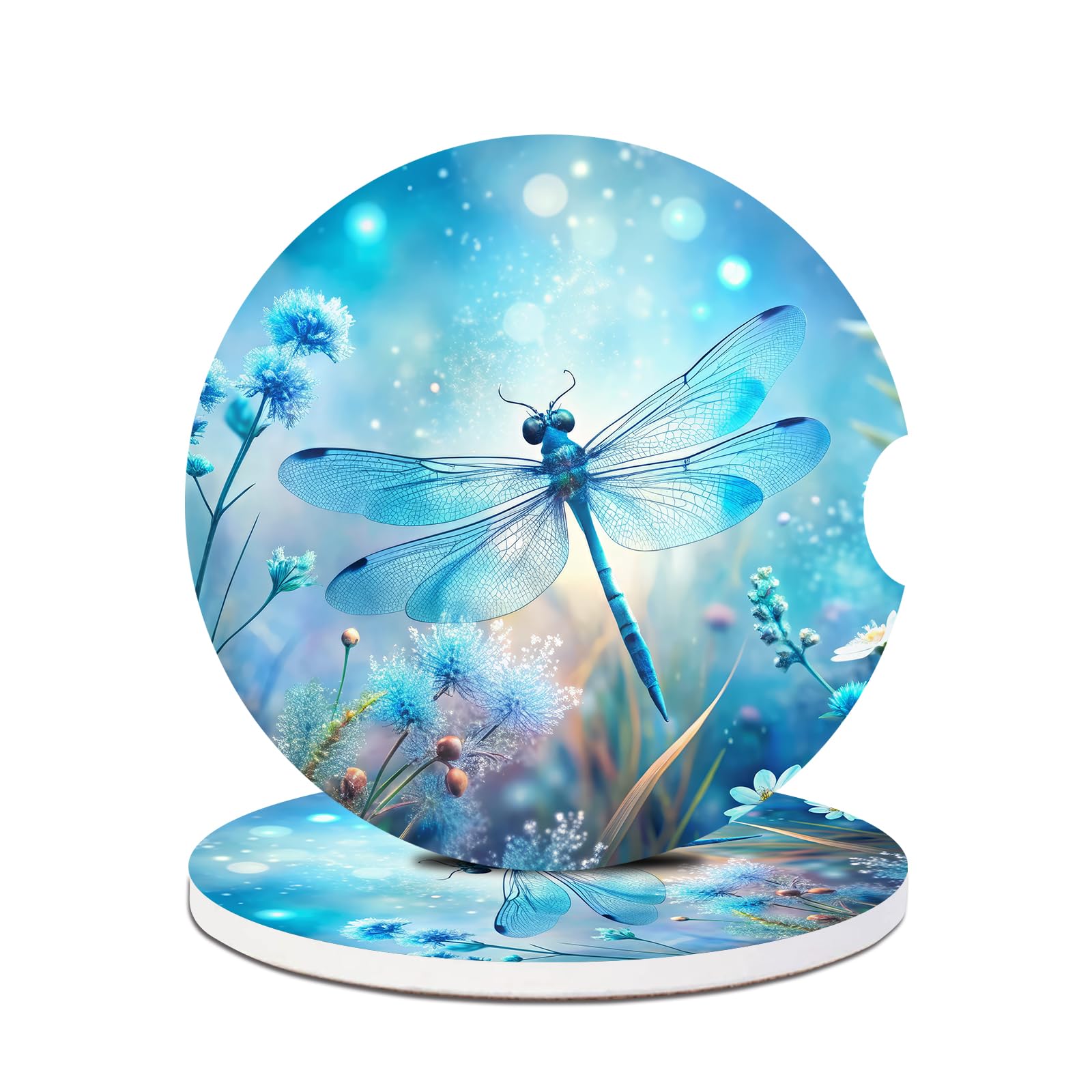 Paquete de 2 portavasos para automóvil, posavasos de cerámica absorbente con libélula azul, posavasos para portavasos de automóvil
