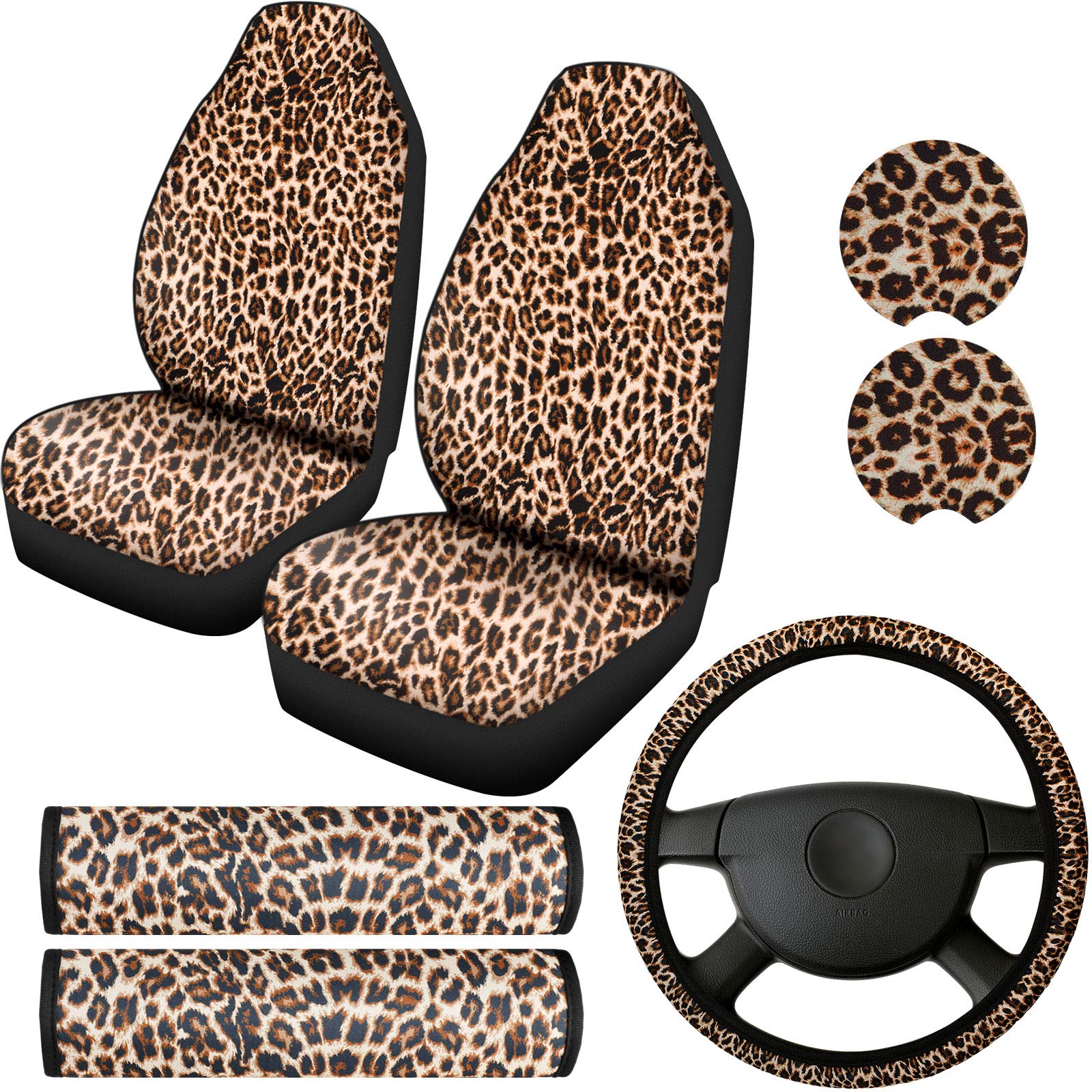 Juego de 7 accesorios de automóvil con estampado de leopardo, 2 fundas para asientos delanteros de automóvil, funda de volante de