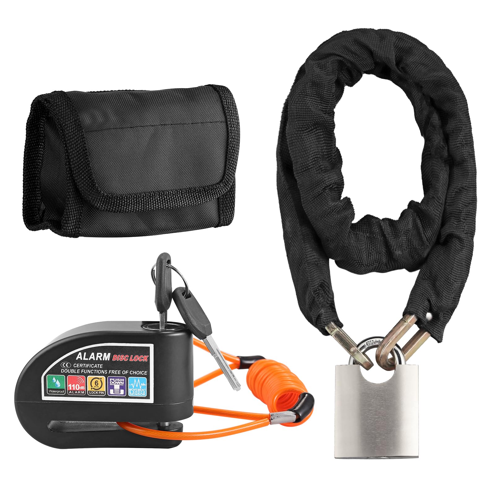 Justech Cerradura de motocicleta, cerradura de cadena de bicicleta + bloqueo de disco de alarma de motocicleta 110dB sonido de ala