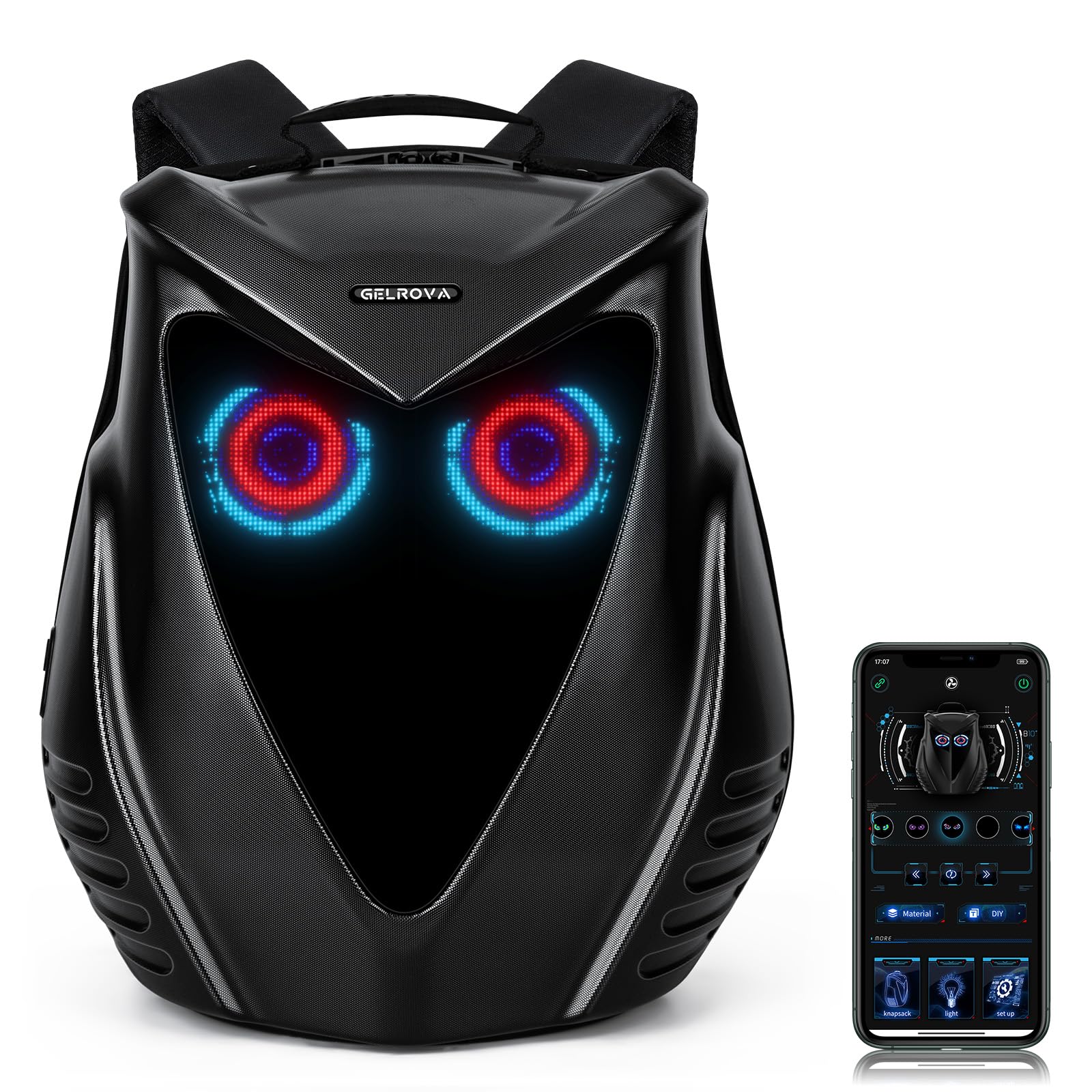 Gelrova Owl Blinking Eyes Motorcycle LED Backpack – 22L Expandable, Hardshell APP-Controlled LED Display Cyberpack, Fits 15.6″ Lap