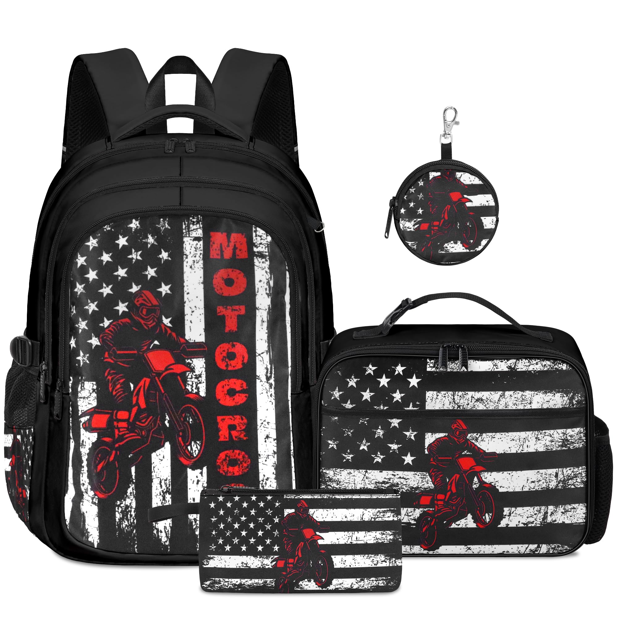 Mochila para niños y niñas, mochilas con lonchera y estuche para lápices para la escuela, bolsa de libros para niños, Motocicleta,