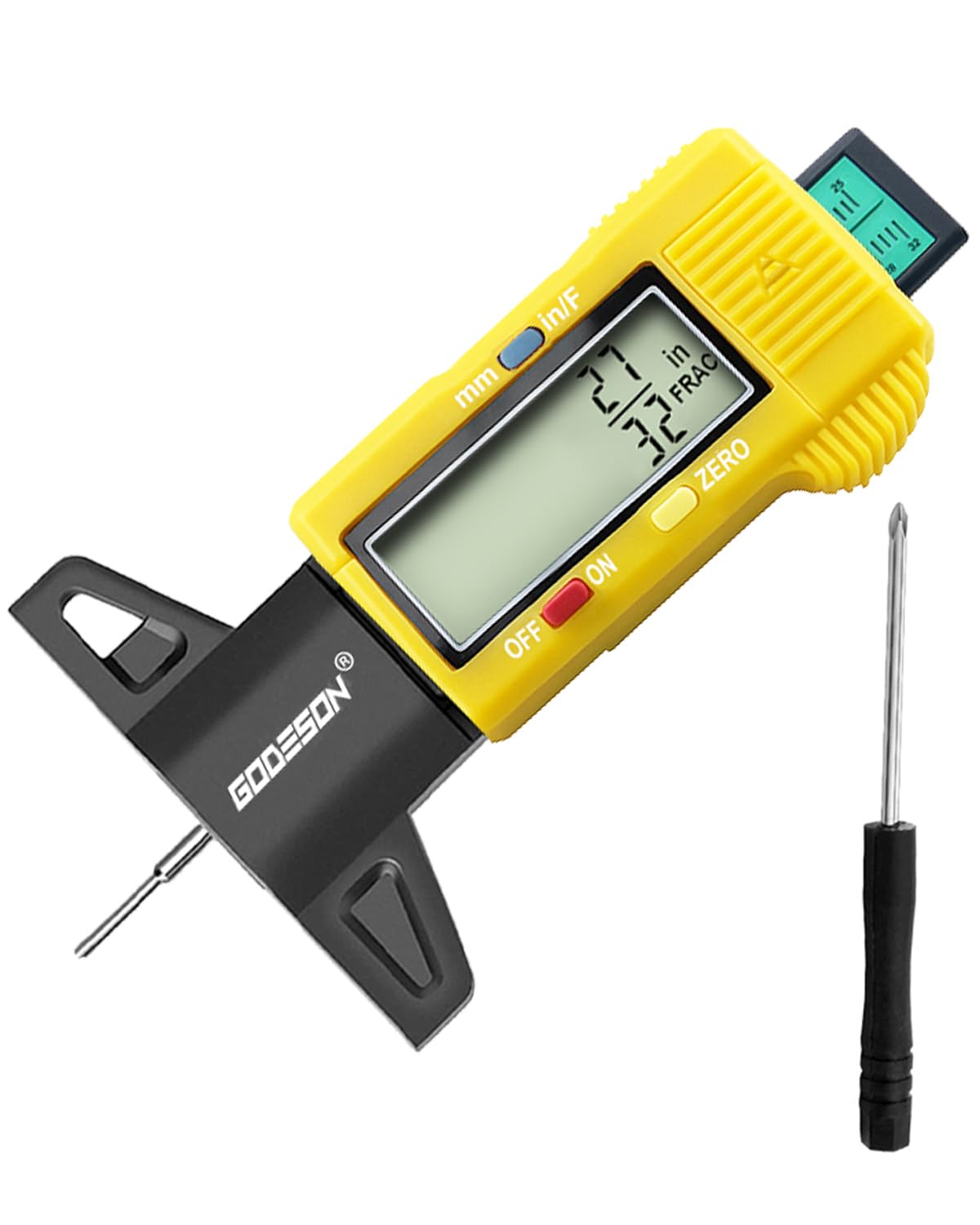 GODESON Medidor digital amarillo de profundidad de banda de rodadura de neumáticos, 3 modos (32 NDS/pulgada decimal/mm), medidor d