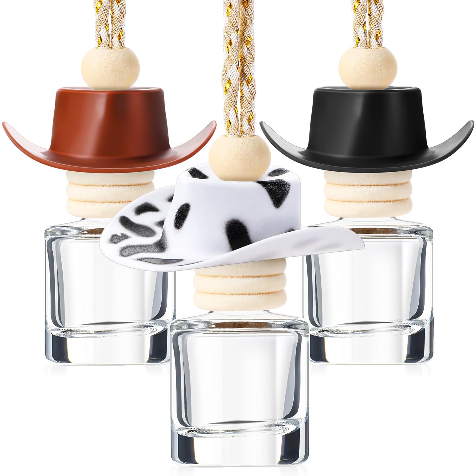 Ambientador de coche con sombrero de vaquero, botellas difusoras colgantes con estampado de vaca, botella de perfume de vidrio vac