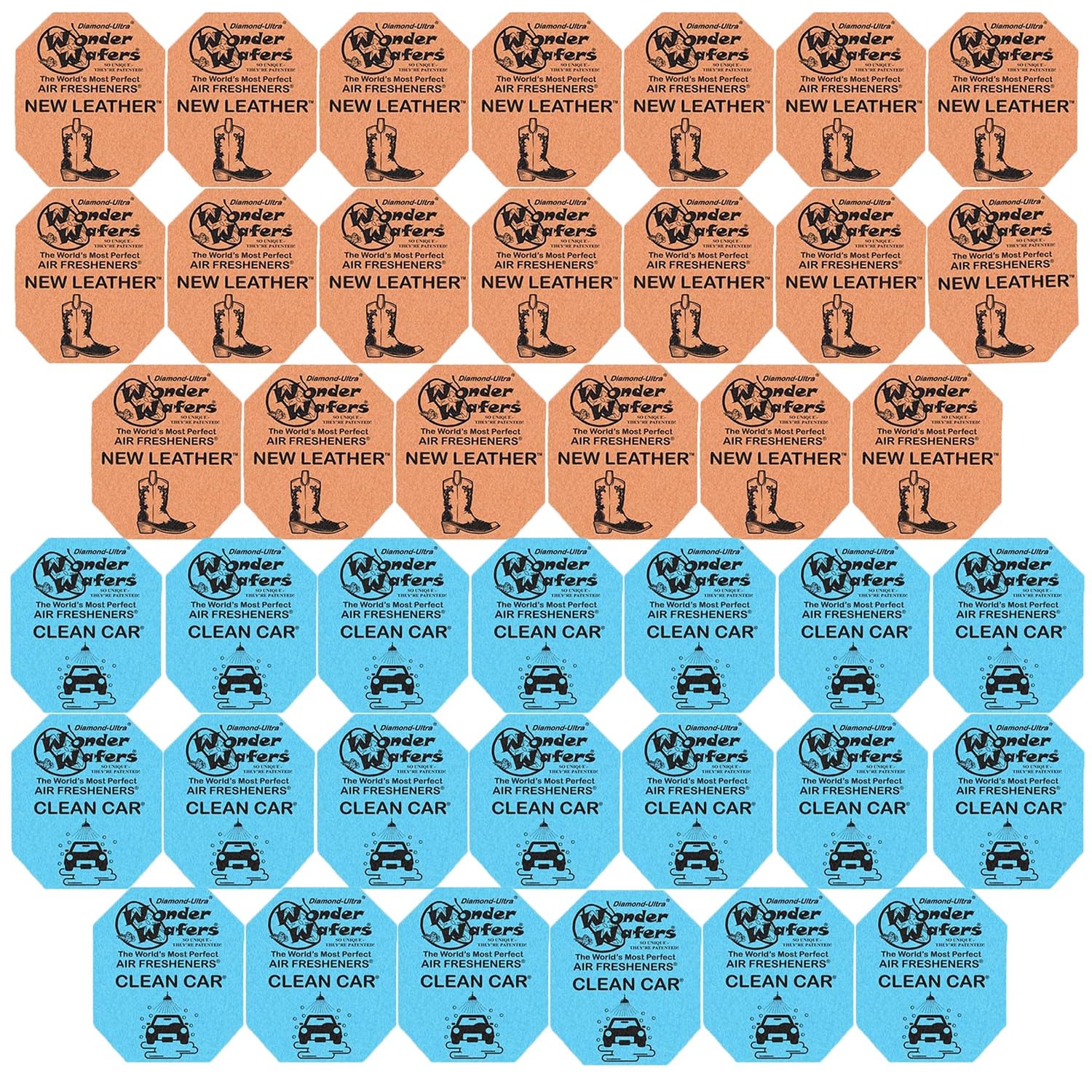 Contenido del paquete: paquete de 40 ambientadores de coche Wonder Wafer: 20 Clean Car, 20 cuero nuevo, 2 aromas