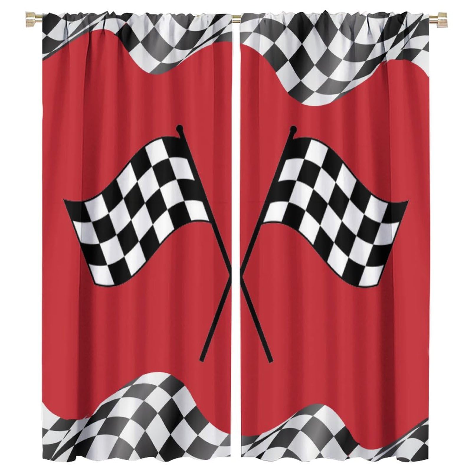 Cortinas de coche de carreras para niños, con bandera de carreras, tratamientos de ventana roja para dormitorio, cuadros blancos y