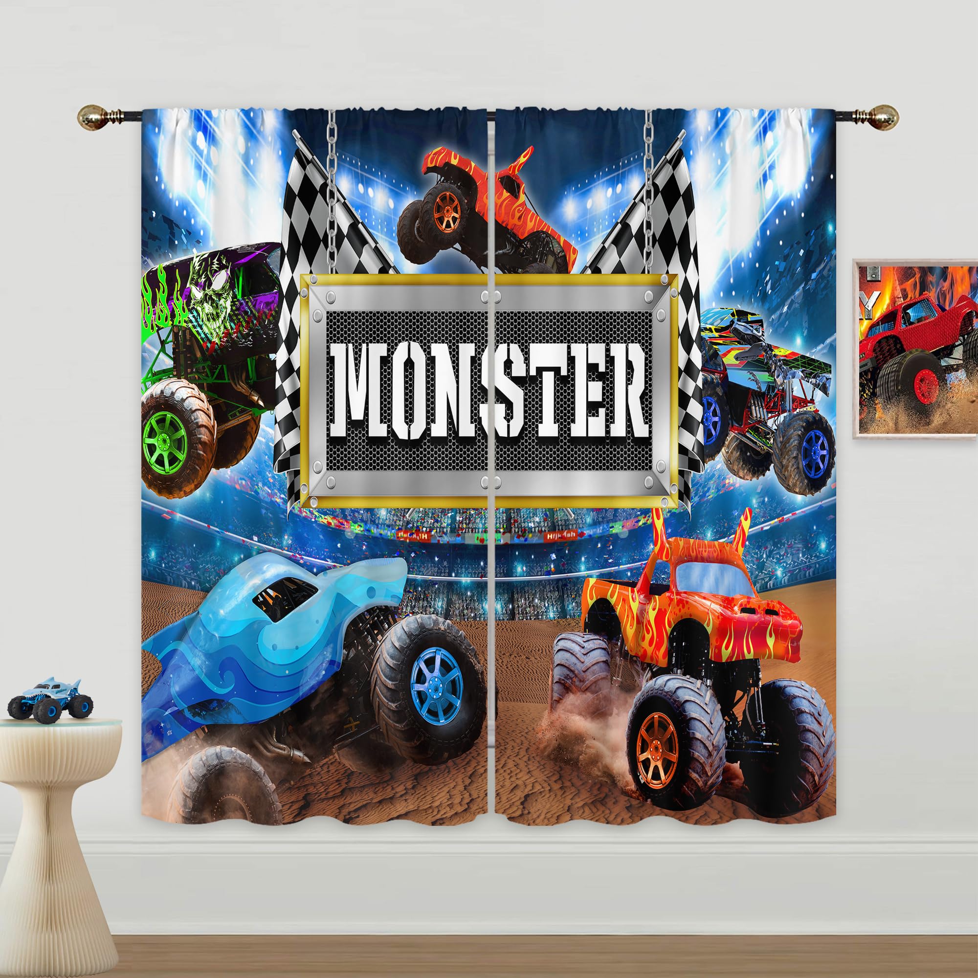Cortinas opacas de carreras, con estampado de monstruos, camión de caricatura, automóvil, colorido tema de carreras, tratamiento d