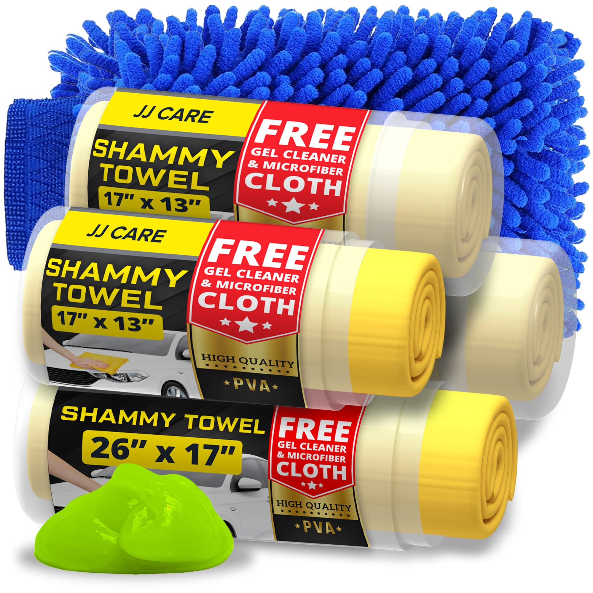 JJ CARE Paño de gamuza (2 piezas grandes + 2 piezas pequeñas), gamuza súper absorbente o automóvil con microfibra y limpiador de g