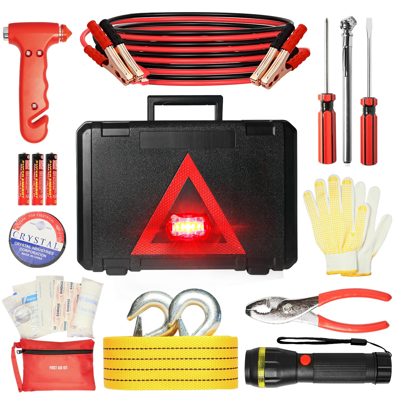 Kit de emergencia para automóvil, kit de emergencia para automóvil con luz de advertencia triángulo reflectante, cable de puente,