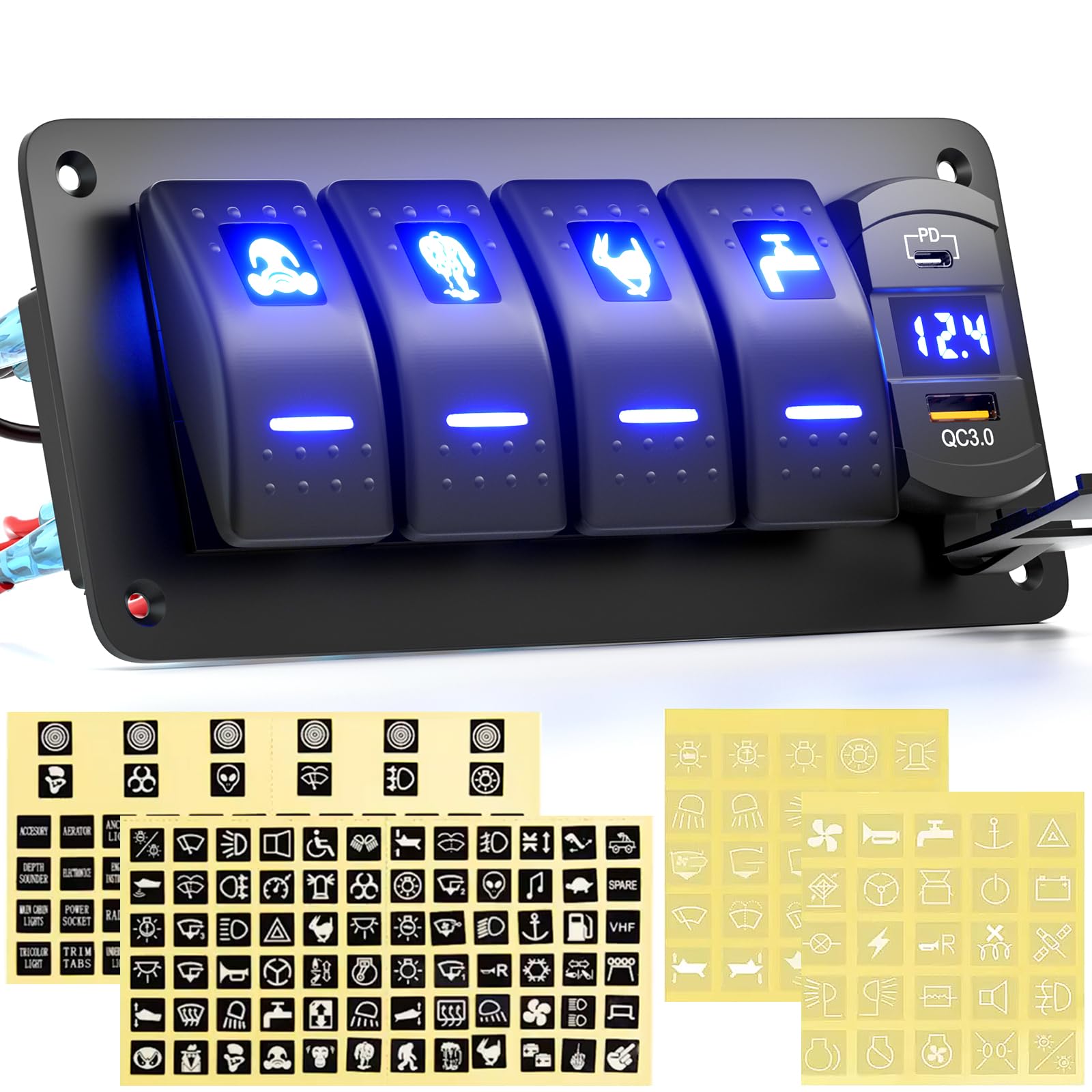 Panel de interruptores basculantes de 4 bandas+ PD de carga rápida + 3.0 USB + voltímetro de aluminio precableado para automóvil,