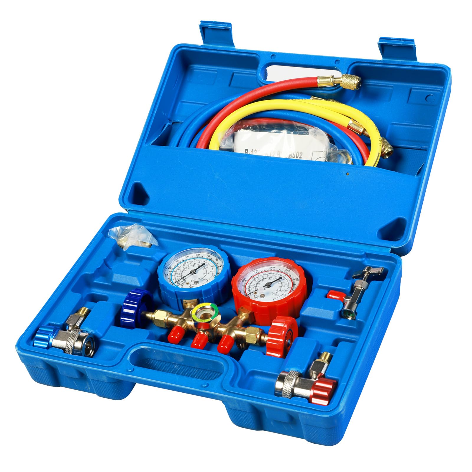Medidores de CA, juego de manómetros de CA para refrigerante R134a R12 R502, coche de 3 vías con mangueras de 5 pies acopladores y