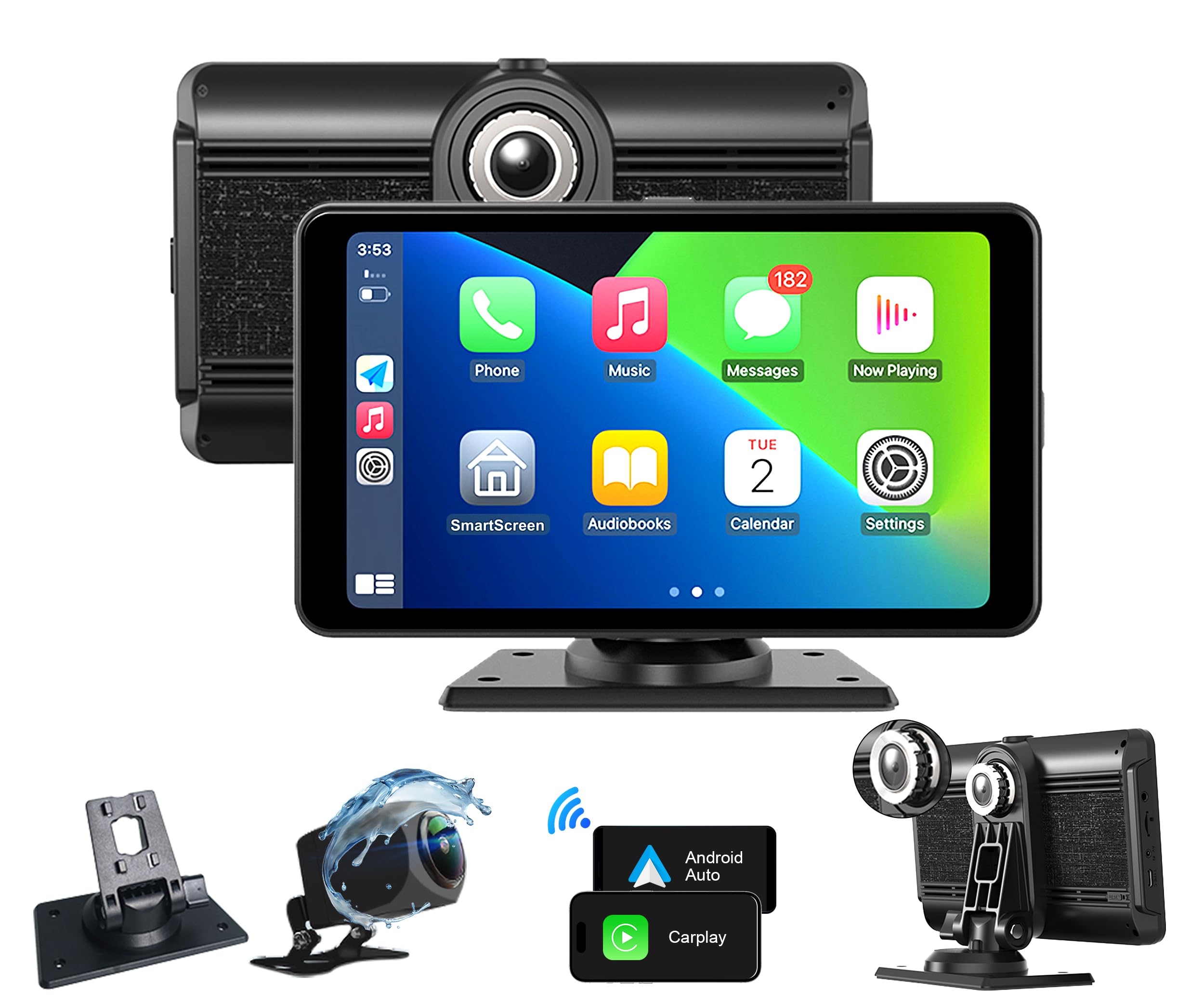 Pantalla Carplay inalámbrica portátil para automóvil, 4K HD A-pple CarPlay y Android Auto pantalla táctil con cámara de respaldo/e