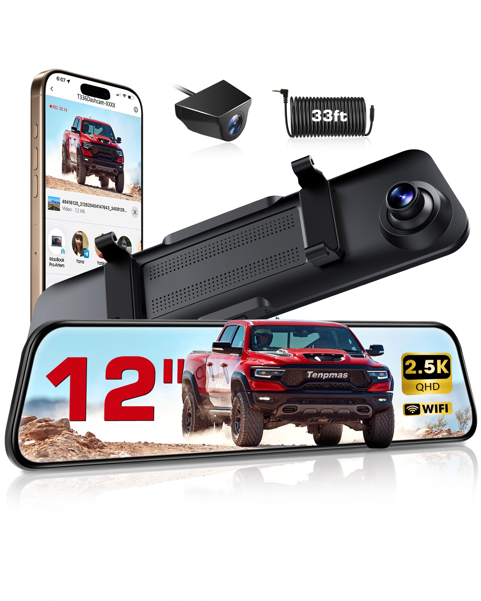 Espejo WiFi de 12 pulgadas, cámara de tablero de 2.5 K, espejo retrovisor, cámara de salpicadero, cámara de respaldo delantera y t