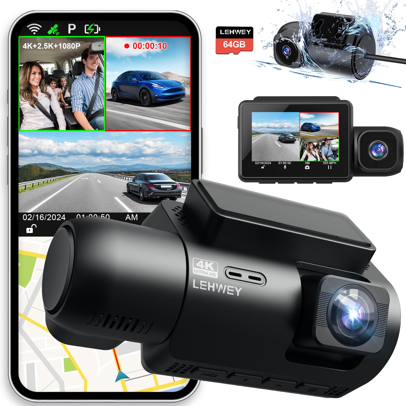 Cámara de salpicadero para auto Dashcam – Lehwey 3 canales 4k 2160P+1440P+1080P Dash Cam frontal y trasera interior, WiFi GPS inte