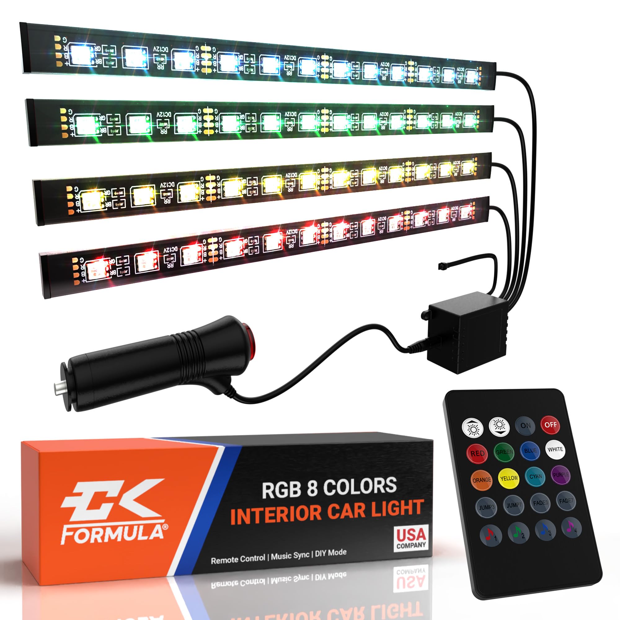 CK Formula Luces LED interiores para automóviles, 8 colores RGB, luces LED interiores con control remoto inalámbrico, sincronizaci
