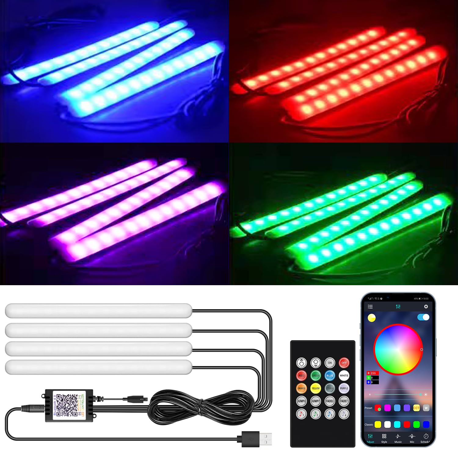 4 luces LED inalámbricas para interiores de automóvil con control remoto, kits de iluminación ambiental, luces de neón para automó