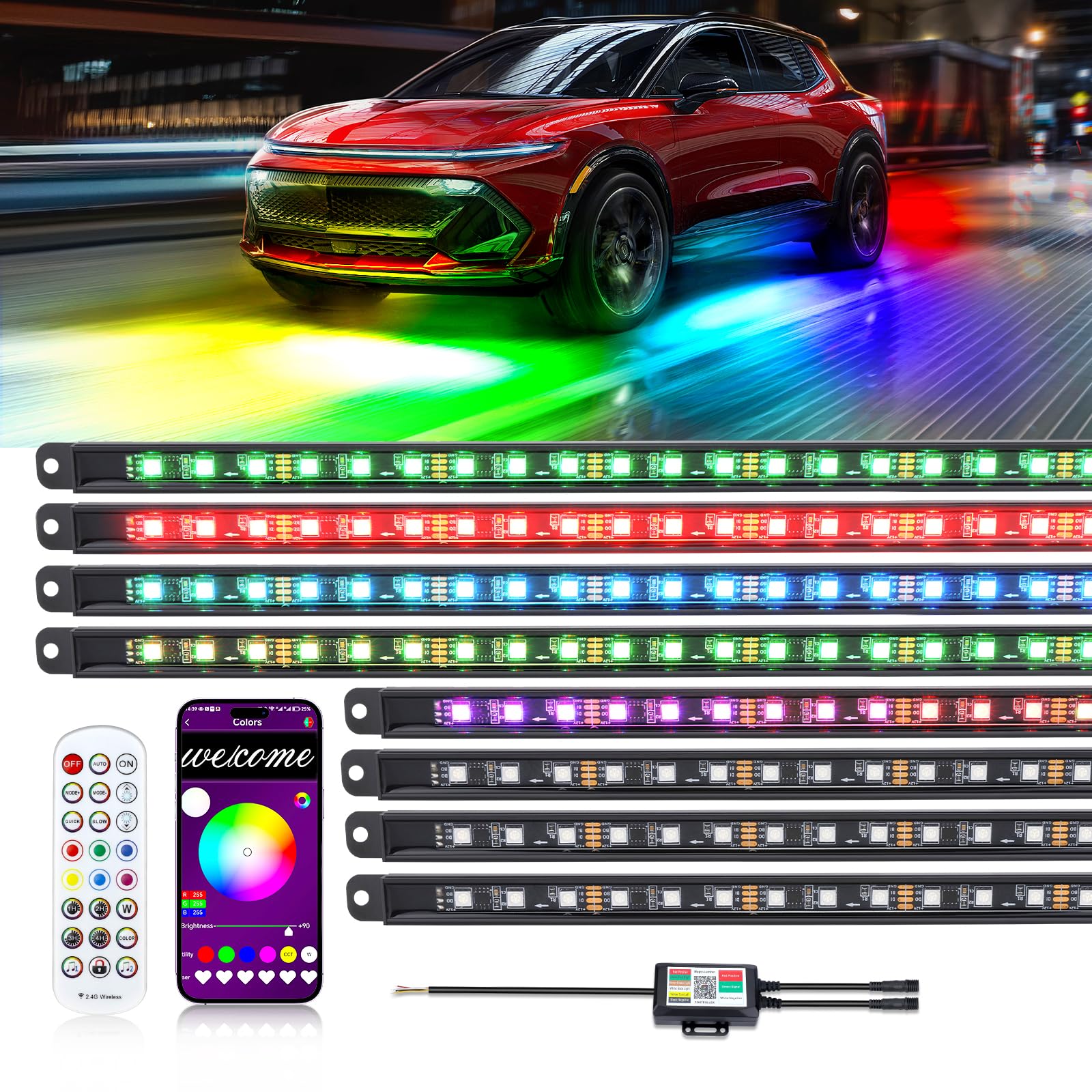 Kit de 8 barras de luz para interior de automóvil, aplicación inalámbrica y control remoto, luces de persecución Dreamcolor, tira