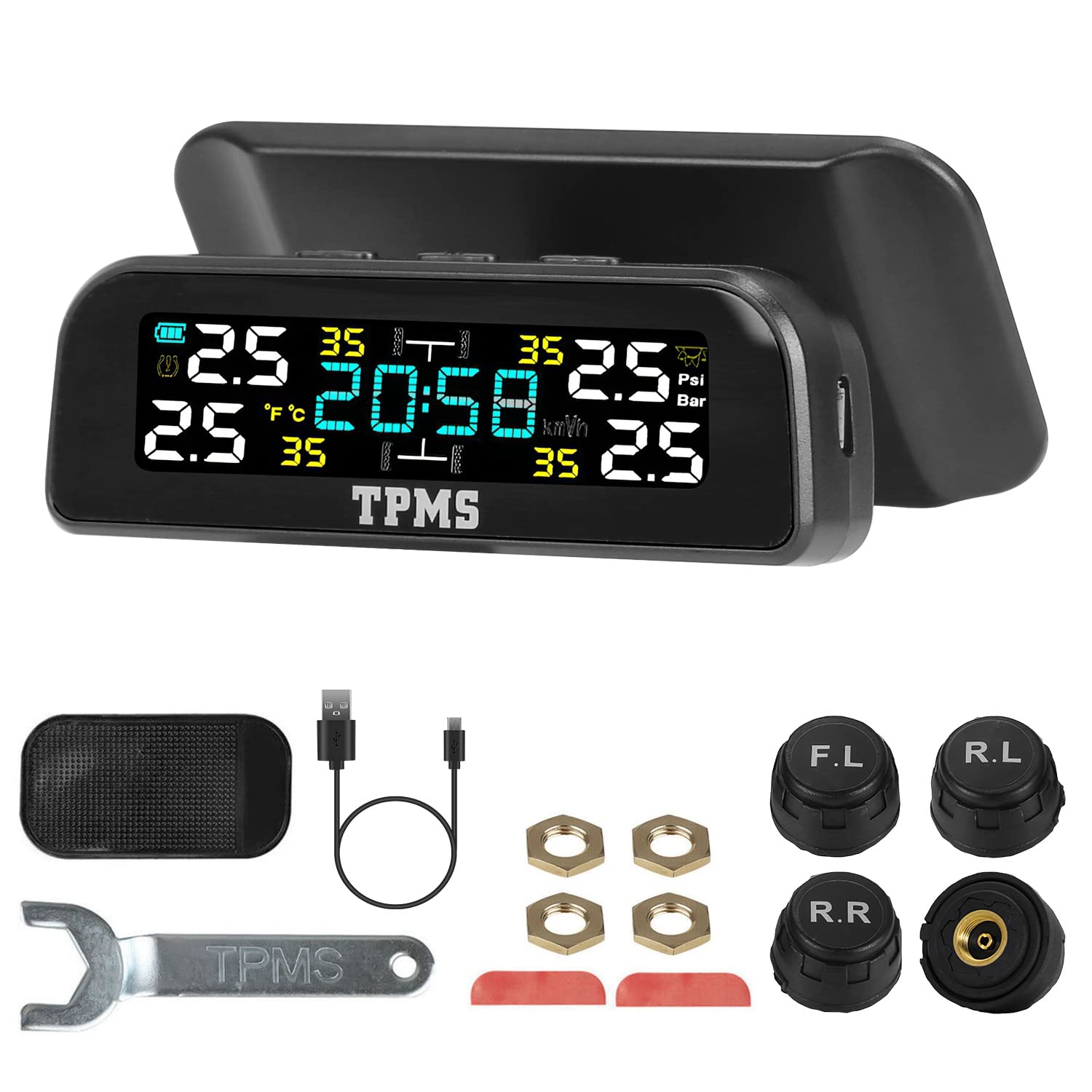 Sistema de monitoreo de presión de neumáticos TPMS Monitor de presión de neumáticos con carga solar y USB, 4 sensores de neumático