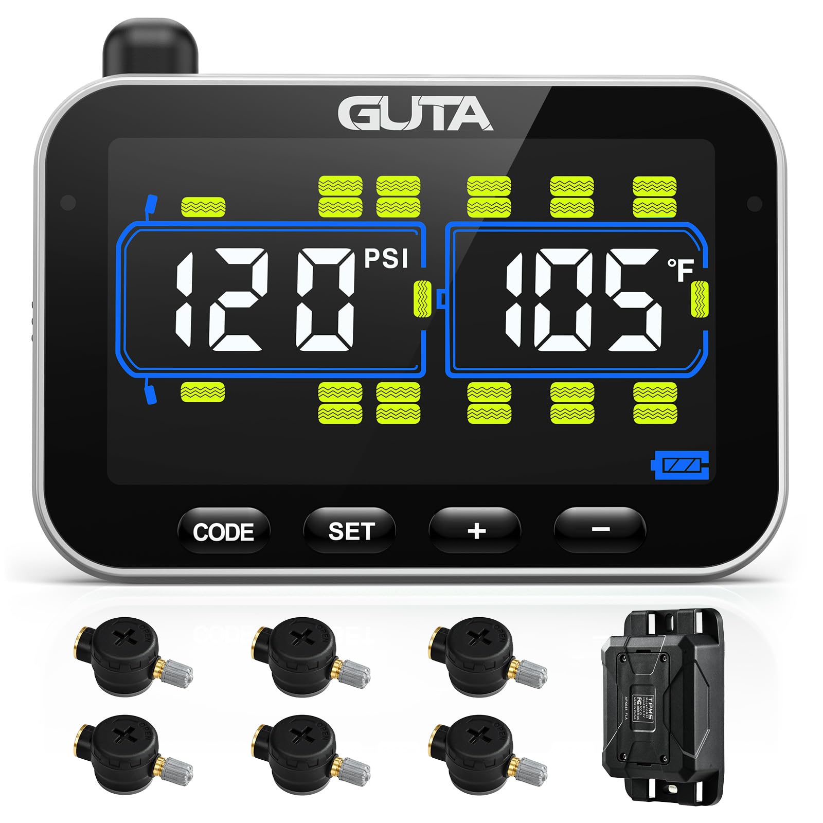 GUTA Sistema de monitoreo de presión de neumáticos, remolque RV TPMS con 6 sensores de flujo a través y pantalla LCD a color, 6 mo