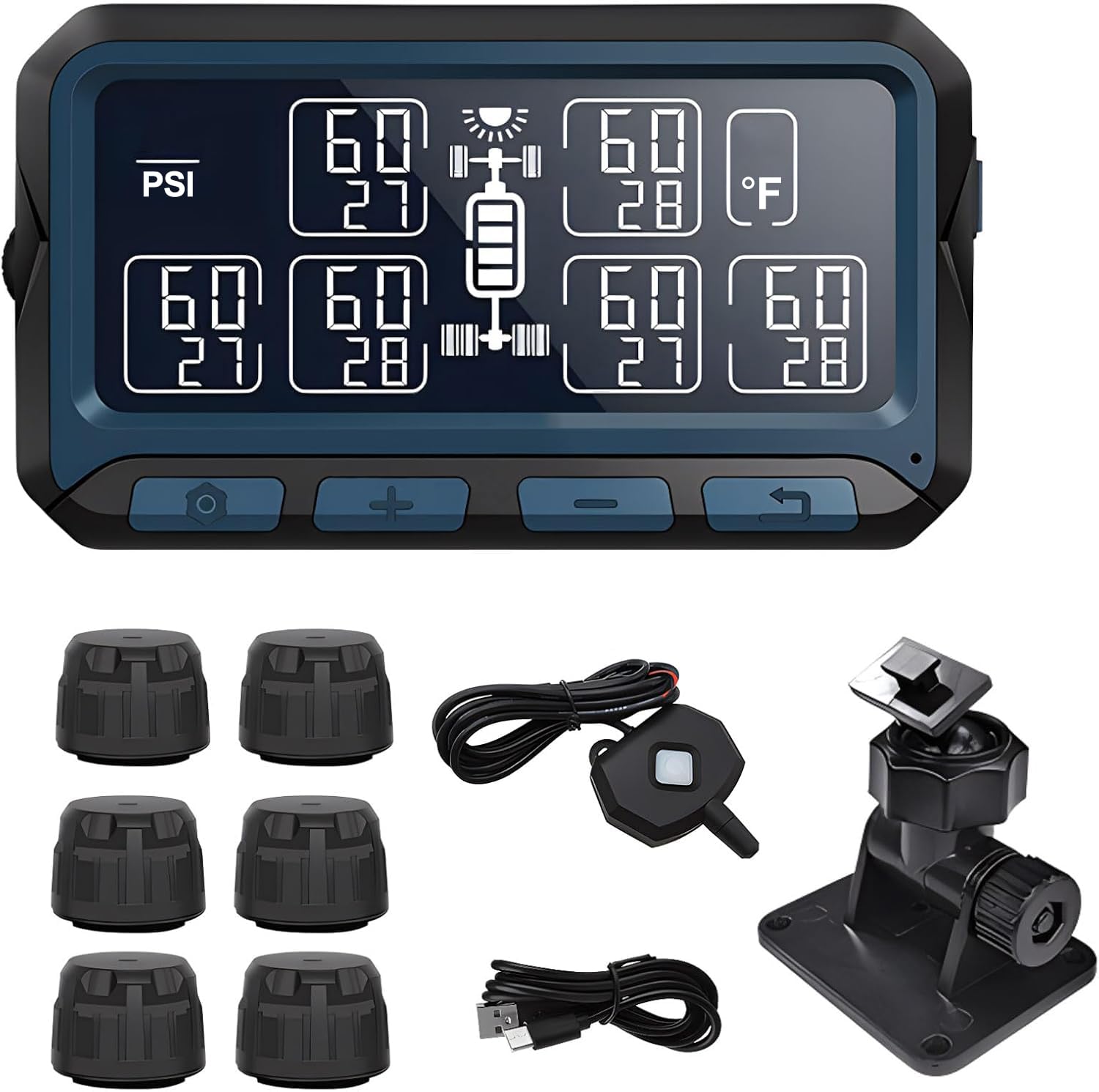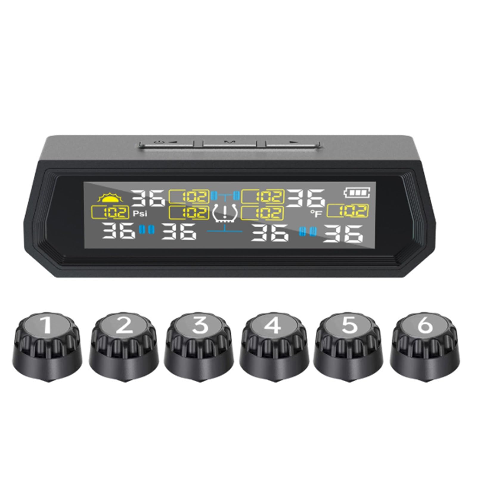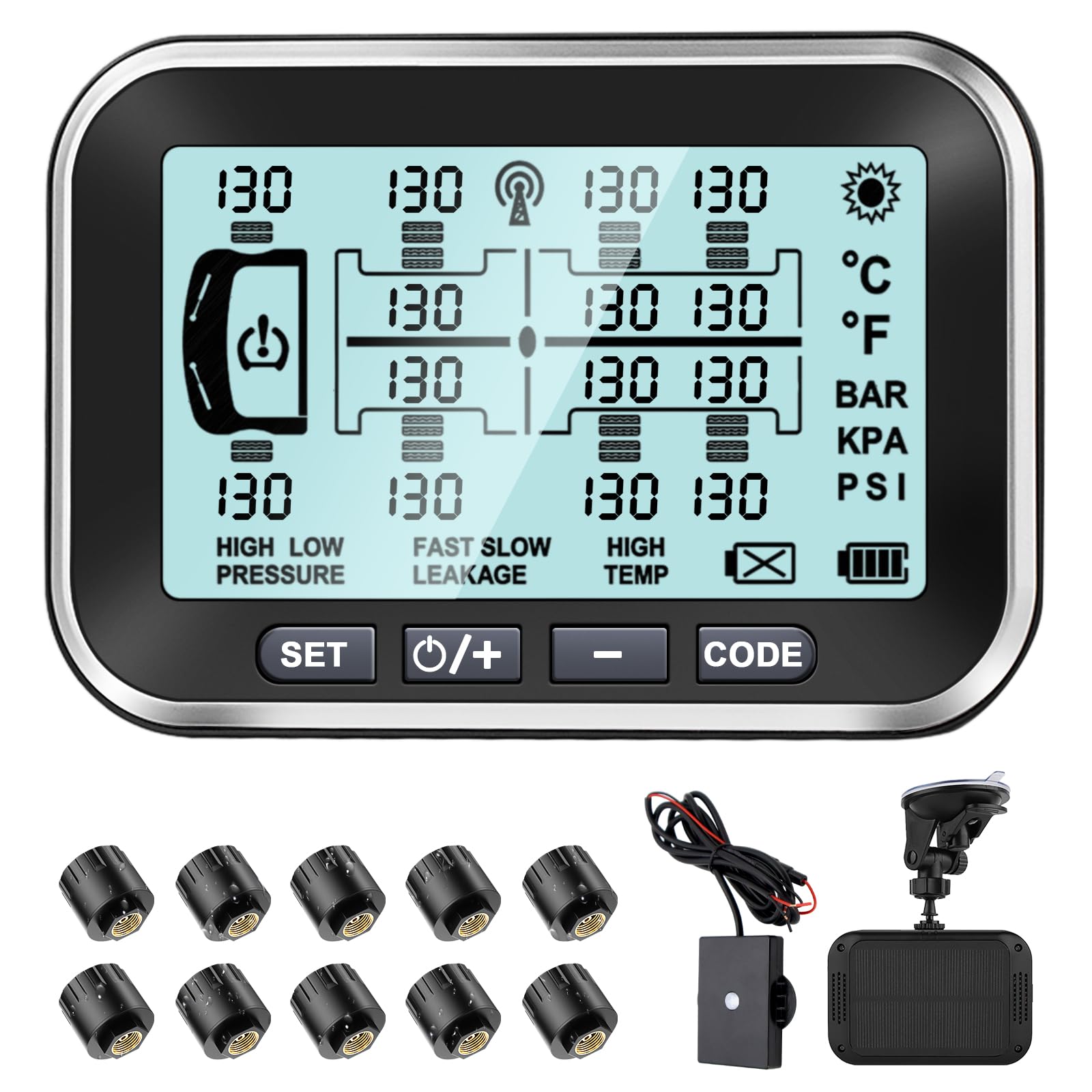 TPMS Kit de monitor de presión de neumáticos – Pantalla de carga solar y USB con alertas de presión y temperatura en tiempo real,