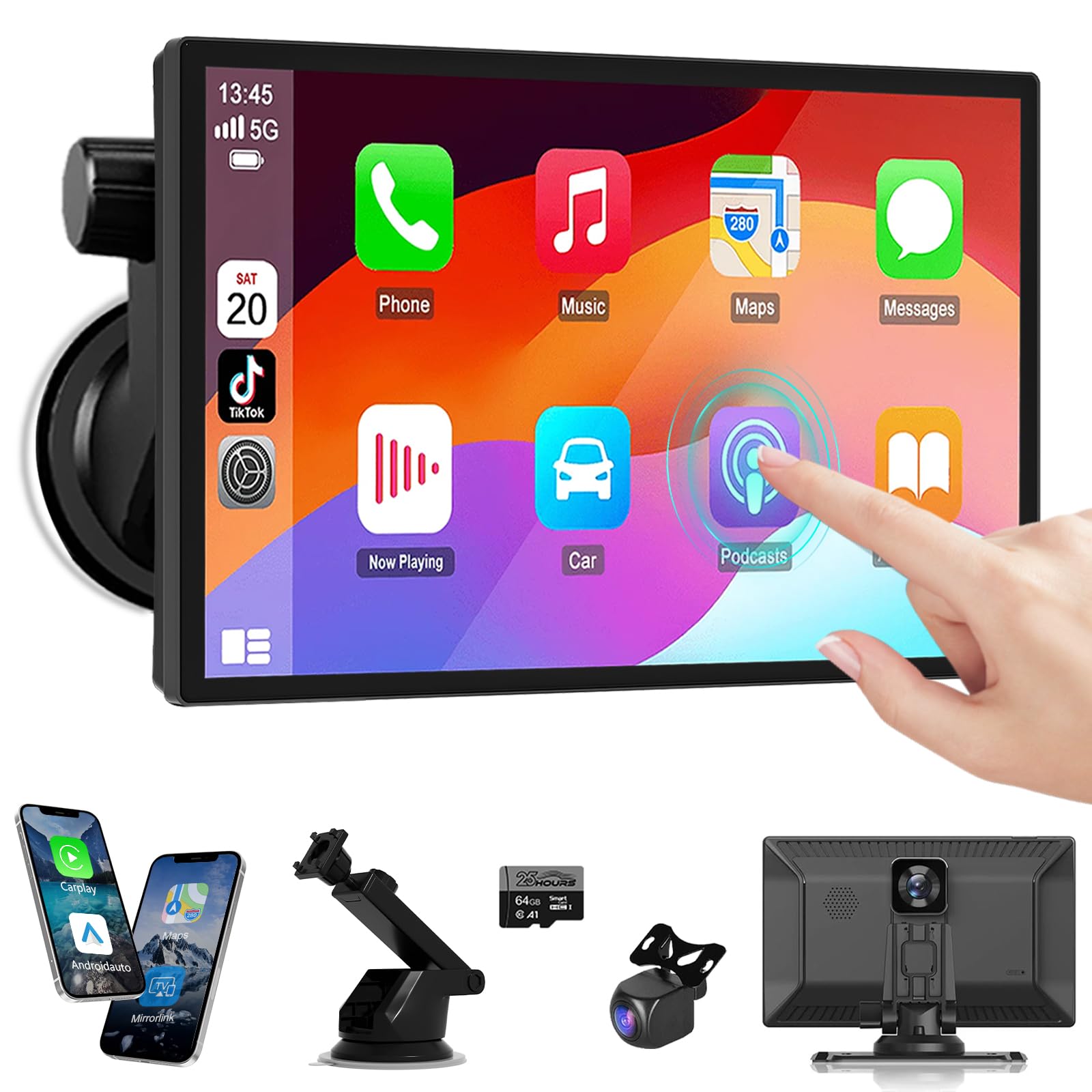 Pantalla Carplay inalámbrica portátil de 9 pulgadas para automóvil con cámara de tablero 4K y cámara de respaldo de 1080P, Apple C