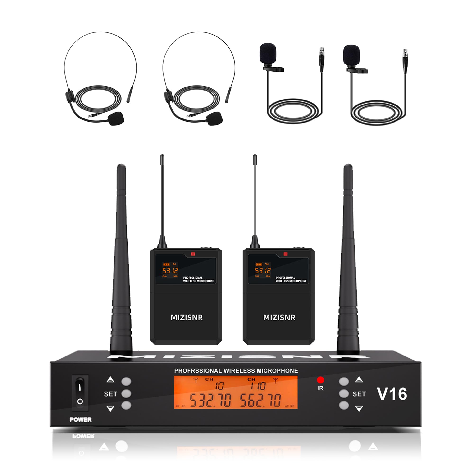 Micrófono de solapa inalámbrico de 2 canales, juego de 2 auriculares y micrófonos de solapa con 200 receptores de metal UHF de fre