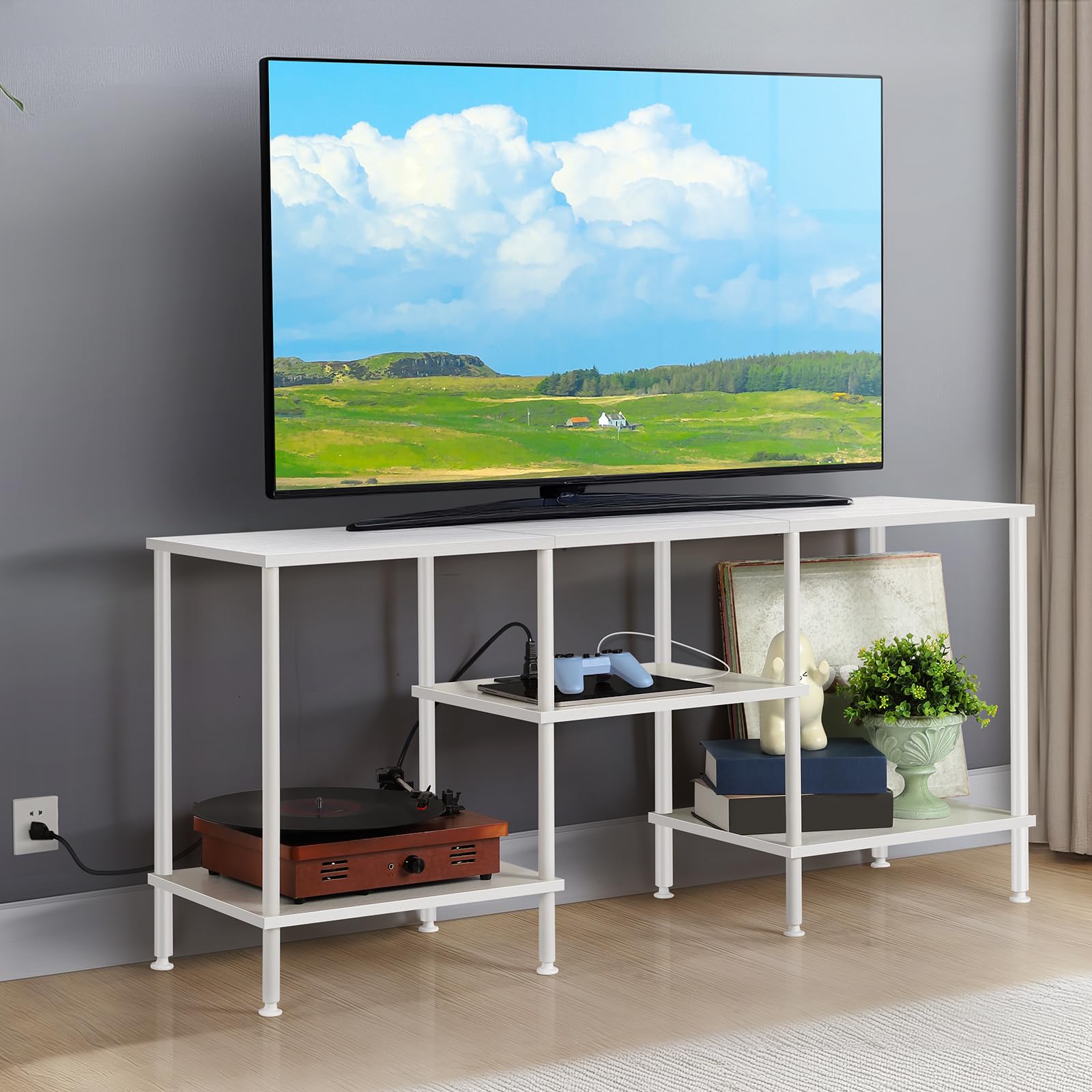 Soporte de TV para dormitorio de hasta 50 pulgadas, moderno soporte de TV con tomas de corriente, pequeño centro de entretenimient