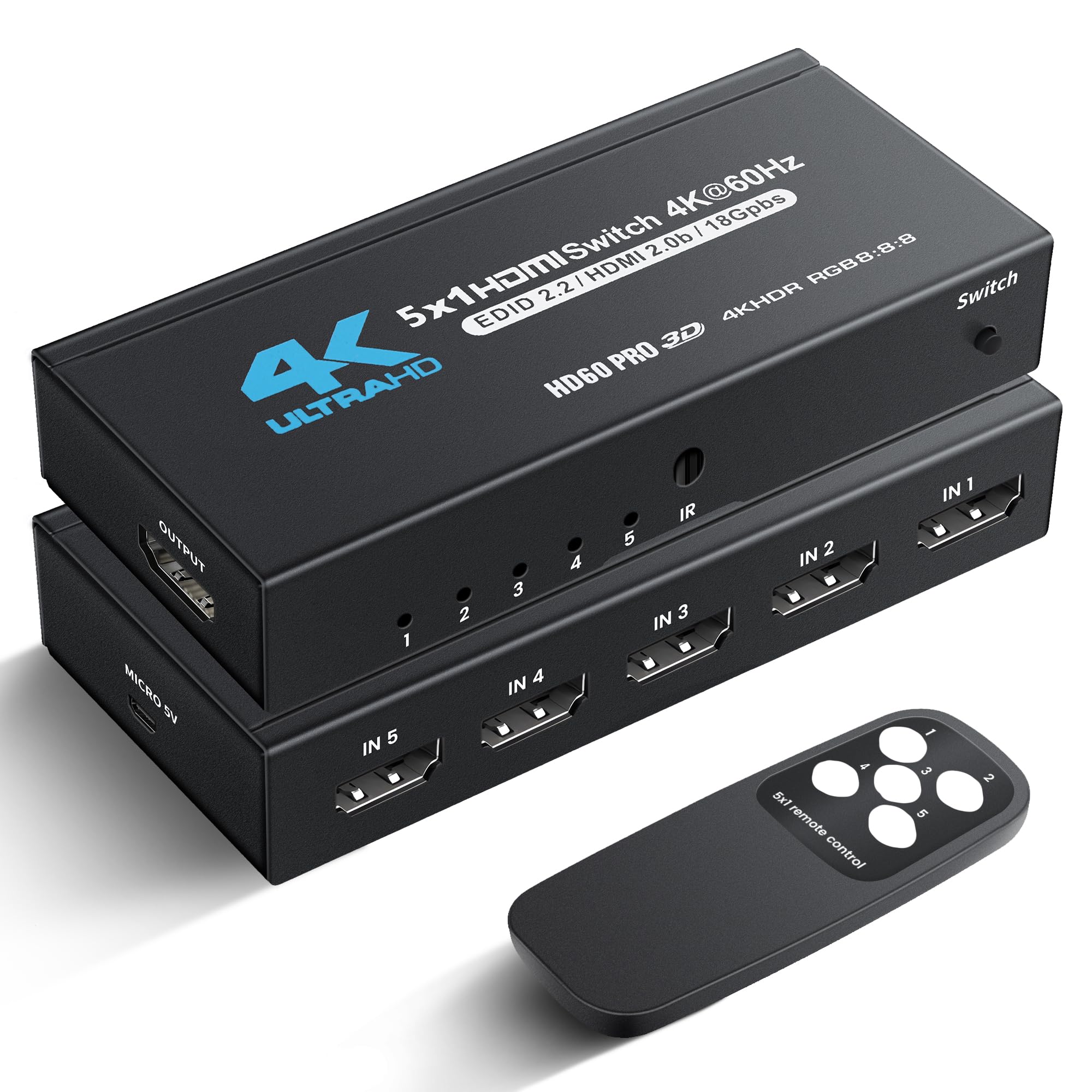 NEWCARE Interruptor HDMI 5 en 1 salida 4K @60Hz, 5×1 HDMI Splitter Switcher con control remoto IR, caja selectora HDMI de 5 puerto