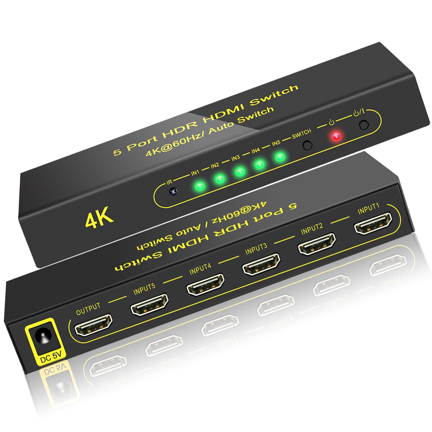 Interruptor HDMI 4K @60Hz HDMI 2.0 Switcher 5 en 1 salida con control remoto, compatible con Dolby Vision Dolby Atmos HDR10 HDCP2.