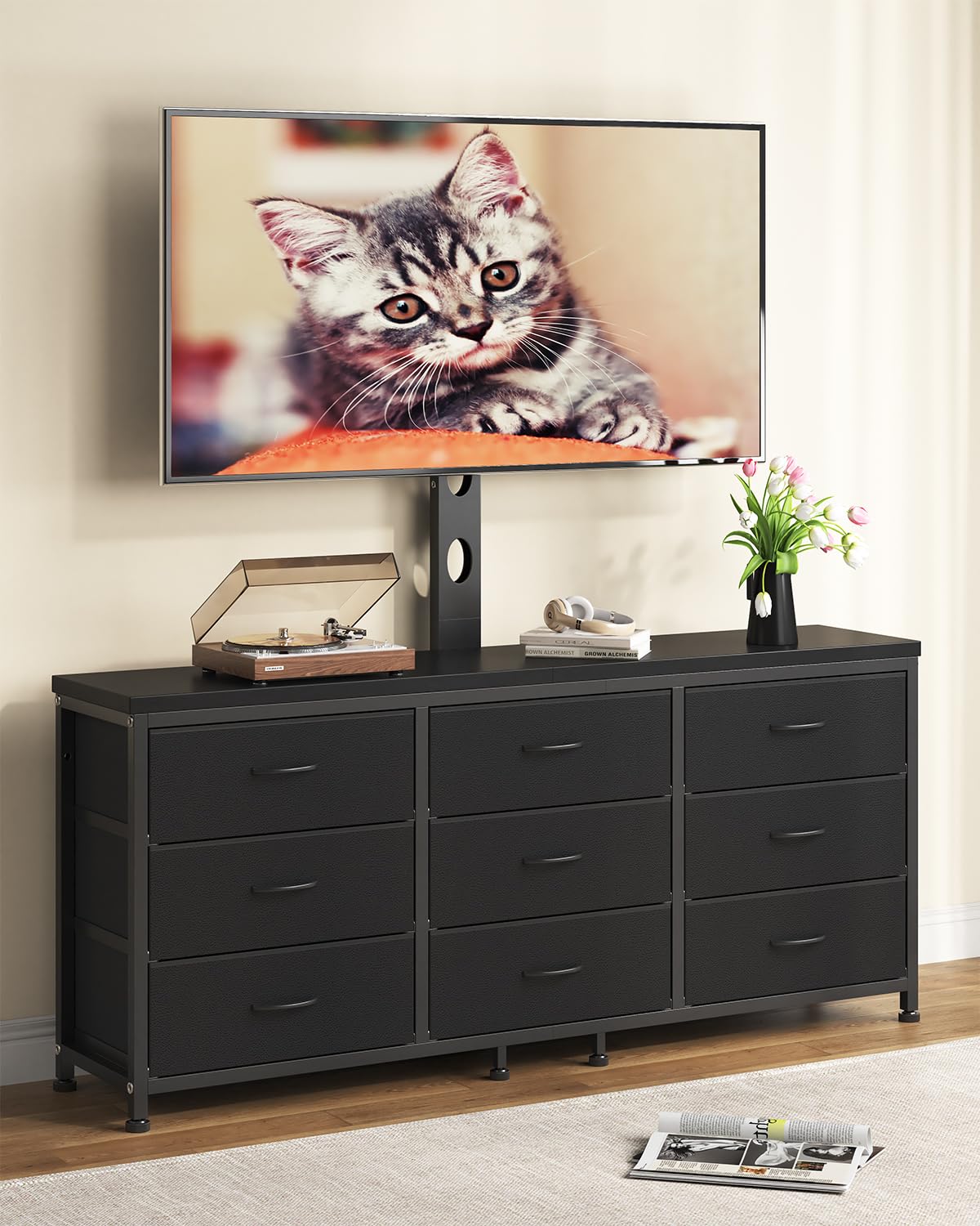 Soporte de TV con soporte para televisores de 32/55/65/75/85 pulgadas, centro de entretenimiento con 9 cajones de tela, consola mu