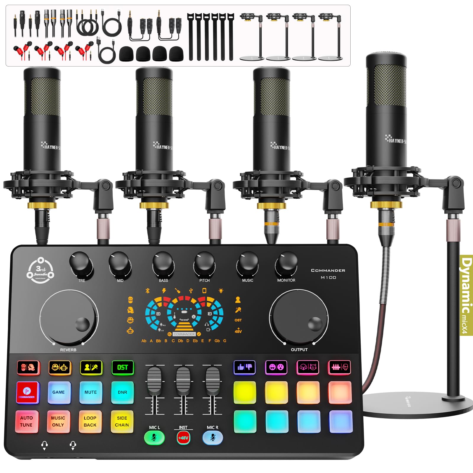 Paquete de equipo de podcast para 4, interfaz de audio con 4 micrófonos dinámicos, 4 soportes de micrófono de escritorio, cambio d