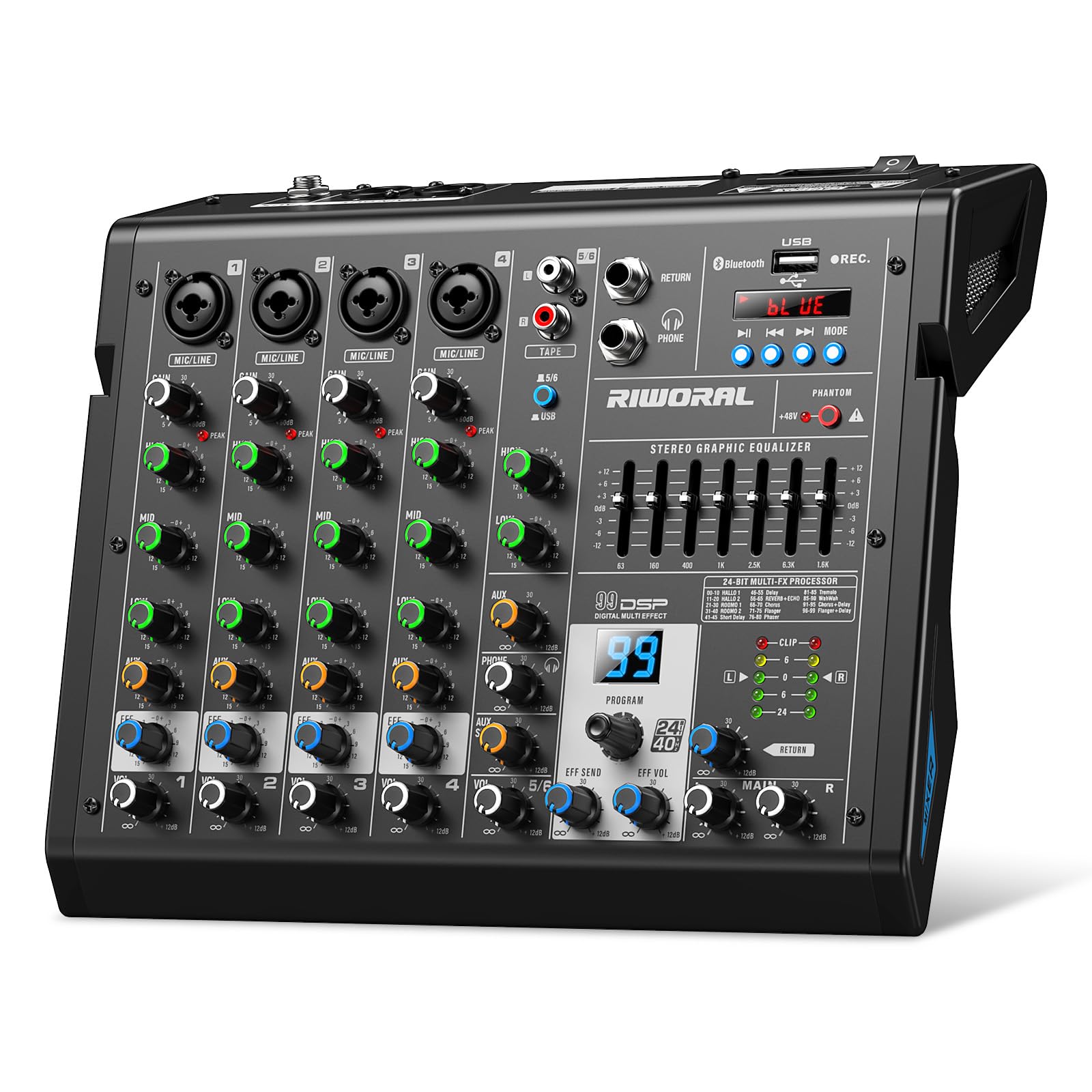 Interfaz de audio de 6 canales, mezclador de DJ, consola de placa de sonido 99 Dsp Reverb efecto de retardo USB Bluetooth Studio m