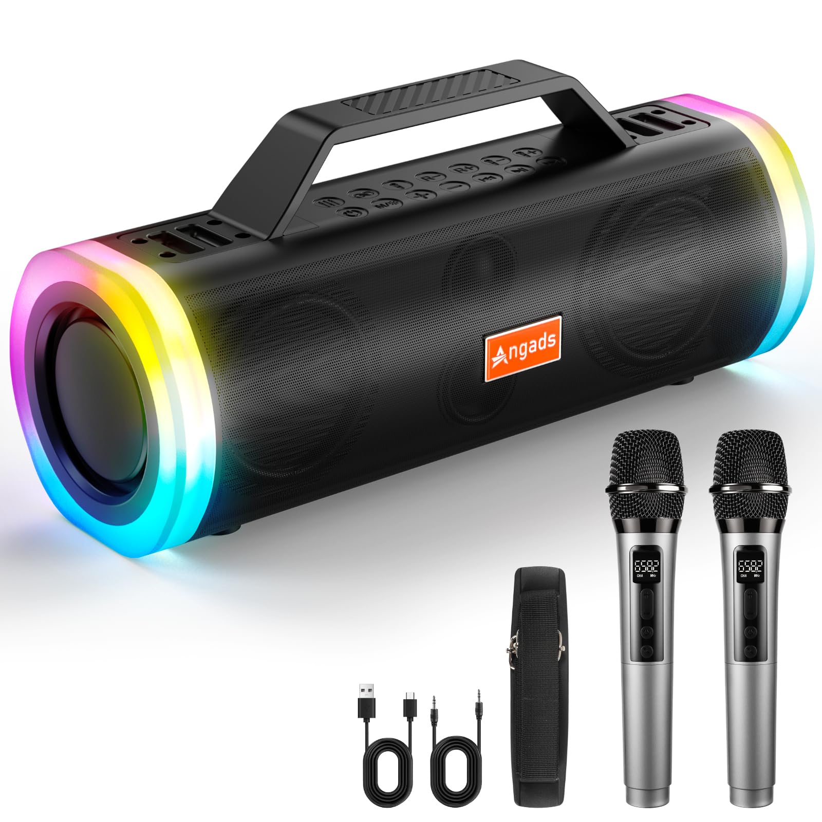 Angads Máquina de karaoke con 2 micrófonos inalámbricos, sistema de altavoces PA portátil, Bluetooth 5.3 corrección de tono y efec