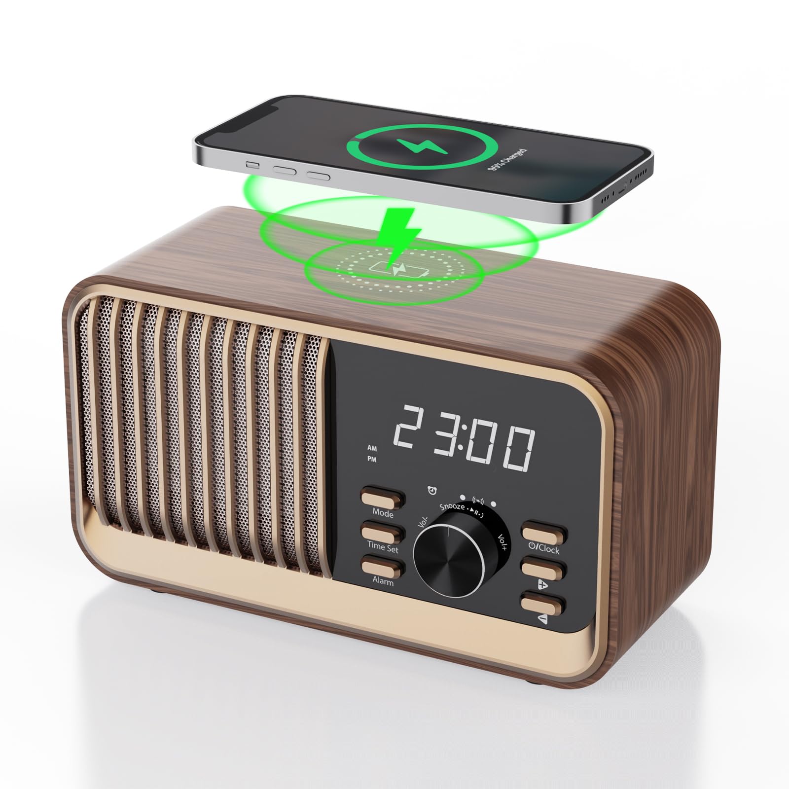 MONODEAL Radio despertador retro con carga inalámbrica rápida, compatible con Bluetooth 5.1/radio FM/puerto USB/tarjeta TF/entrada