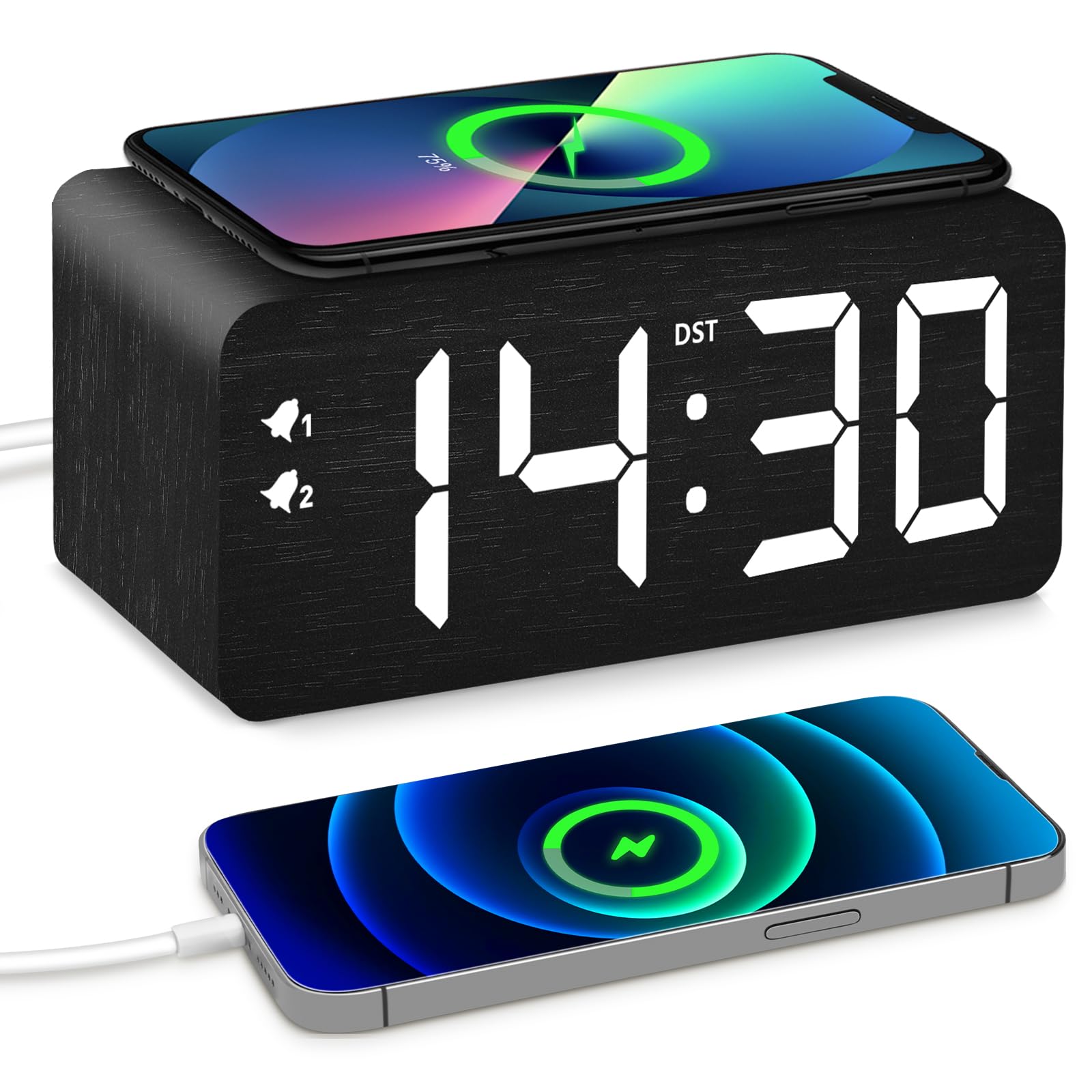 Reloj despertador digital de madera, estación de carga inalámbrica rápida de 10 W y puerto de carga USB, con atenuador continuo, a