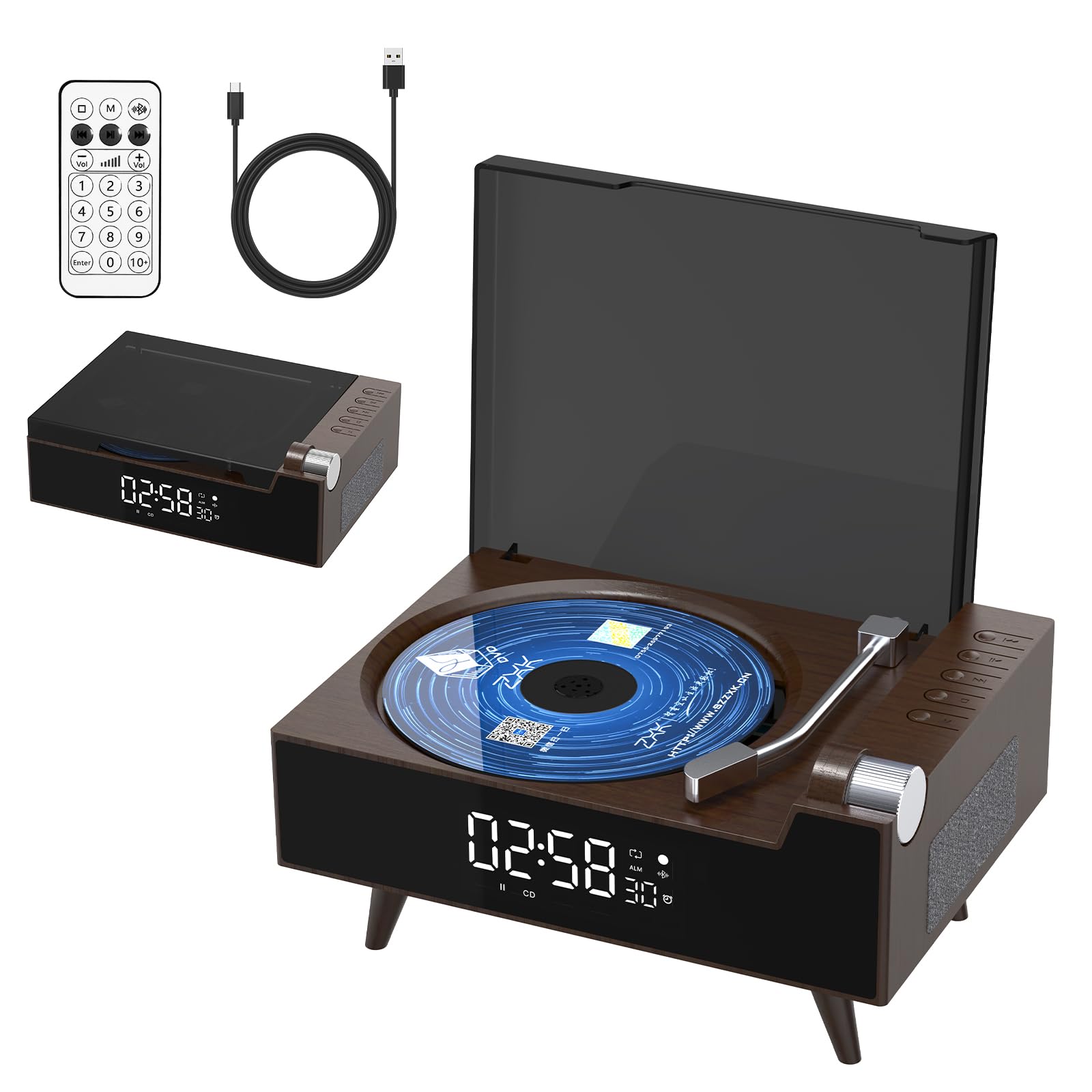 Reproductor de CD con Bluetooth, altavoces de alta fidelidad, radio FM, pantalla LED, temporizador, soporte USB/AUX (marrón oscuro