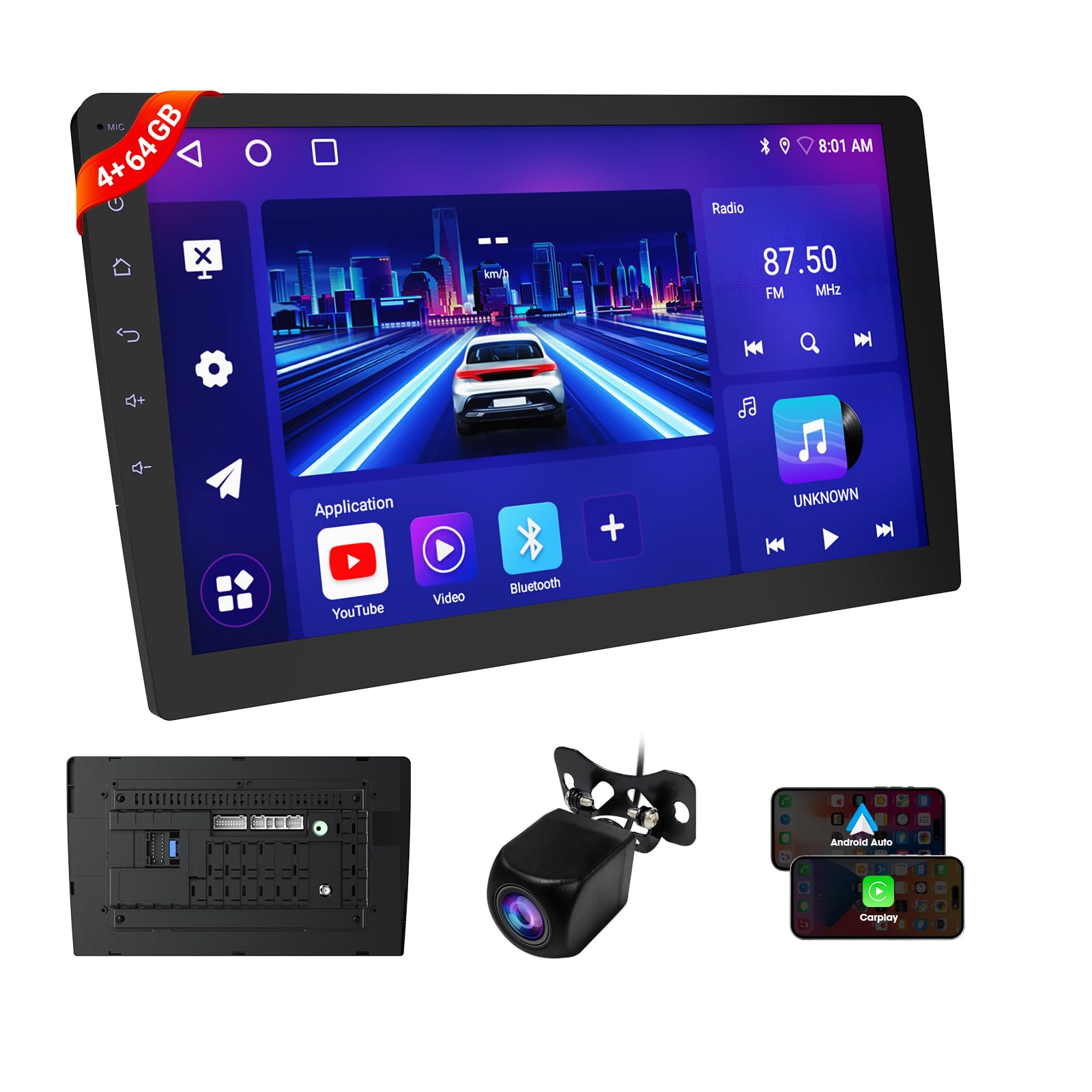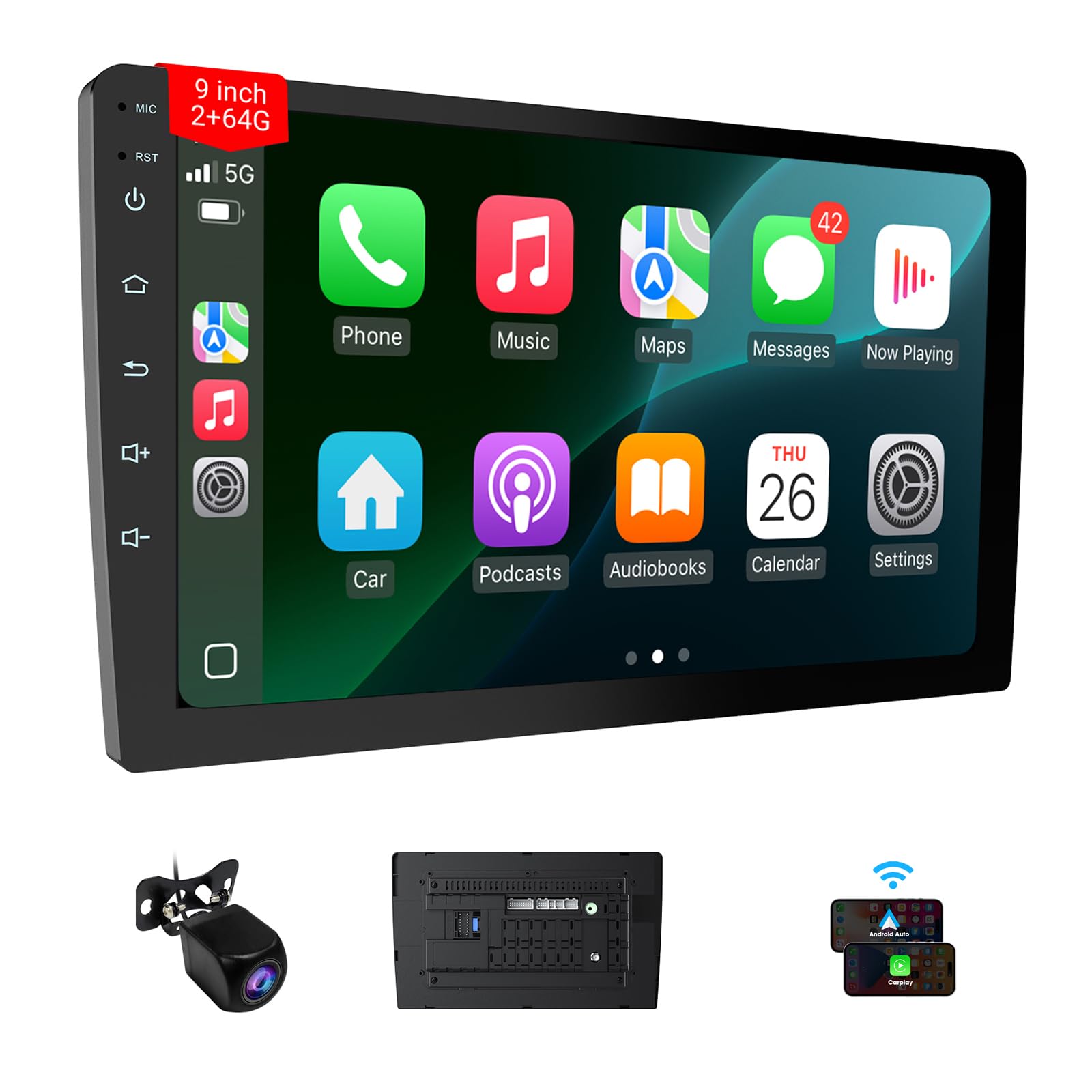 Estéreo inalámbrico de doble DIN de 9 pulgadas, radio para automóvil con Apple Carplay y Android Auto, Bluetooth 5.4, cámara de re
