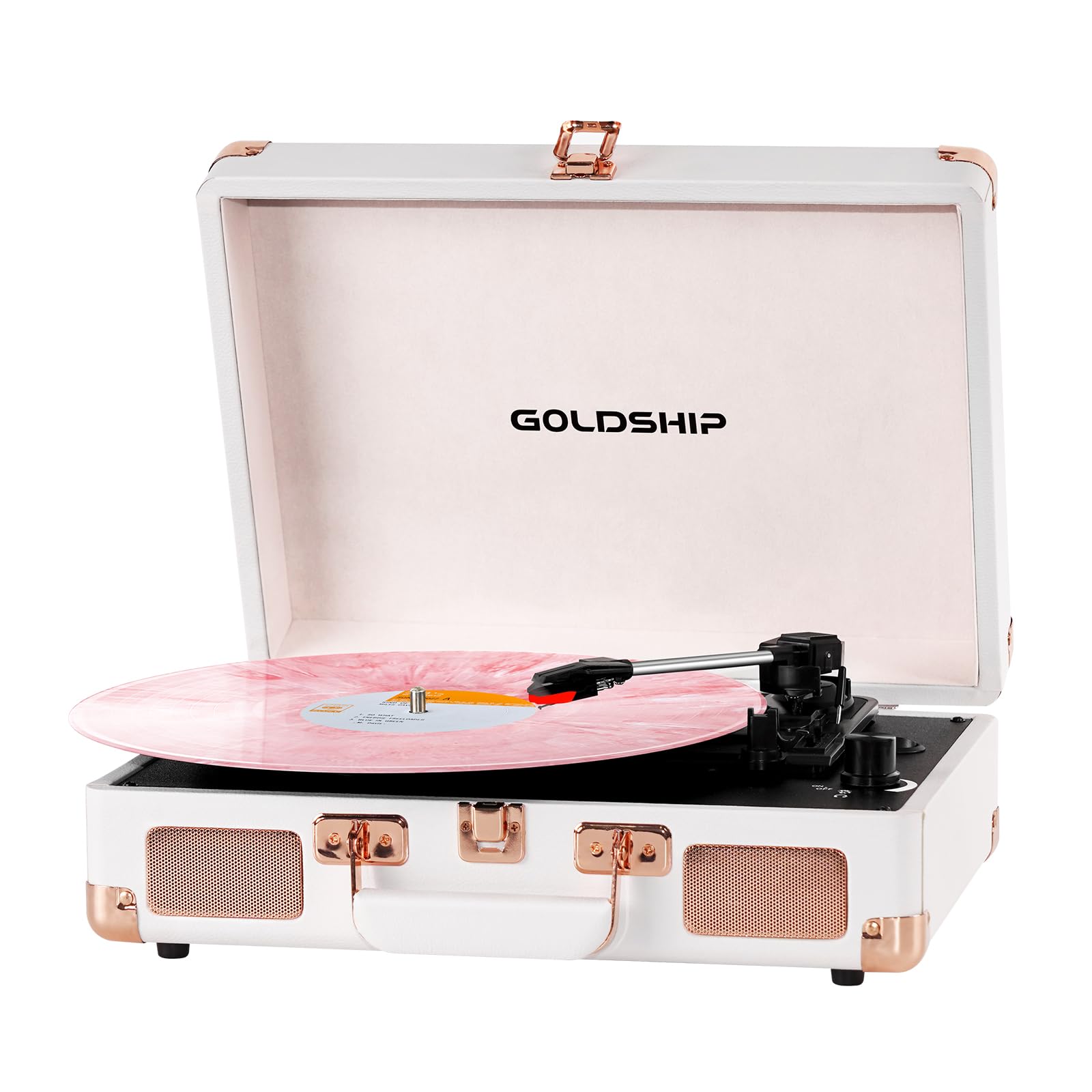 DANFI – Reproductor de discos de vinilo con Bluetooth rosa con altavoces duales, grabación USB, tocadiscos de maleta de 3 velocida