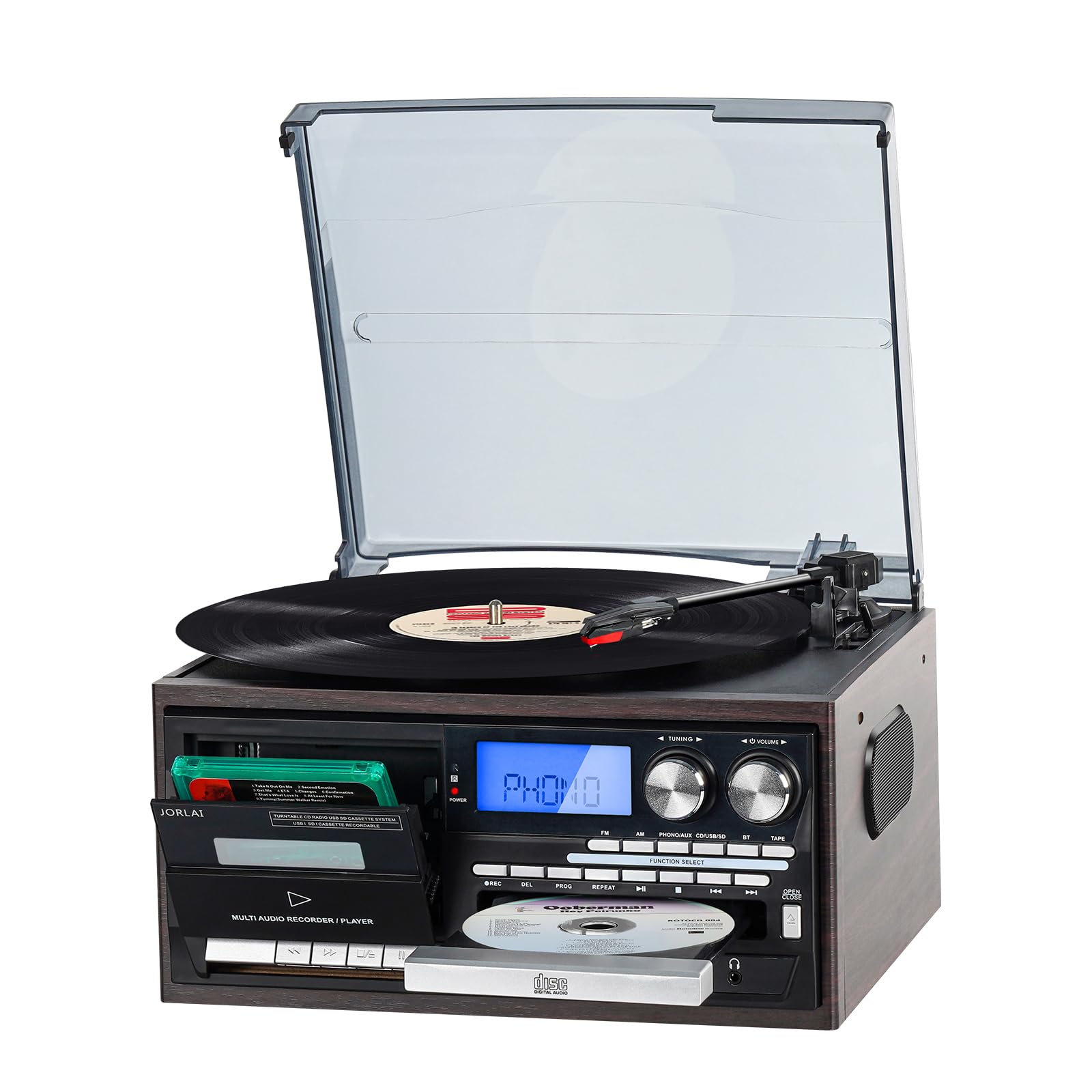 Tocadiscos Bluetooth 9 en 1 con altavoces estéreo integrados, radio AM/FM, reproductor de CD y cassette, reproducción USB/SD, cont