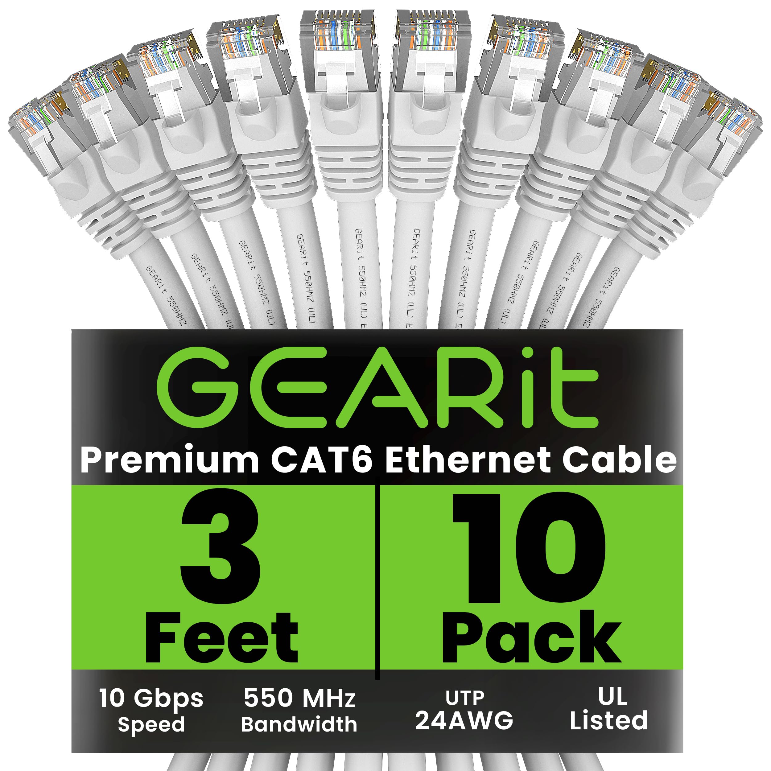 GEARit Cable Ethernet Cat 6 (paquete de 10 unidades de 3 pies), parche de red Cat6, 10 Gbps, RJ45, cable sin enganches, conectores