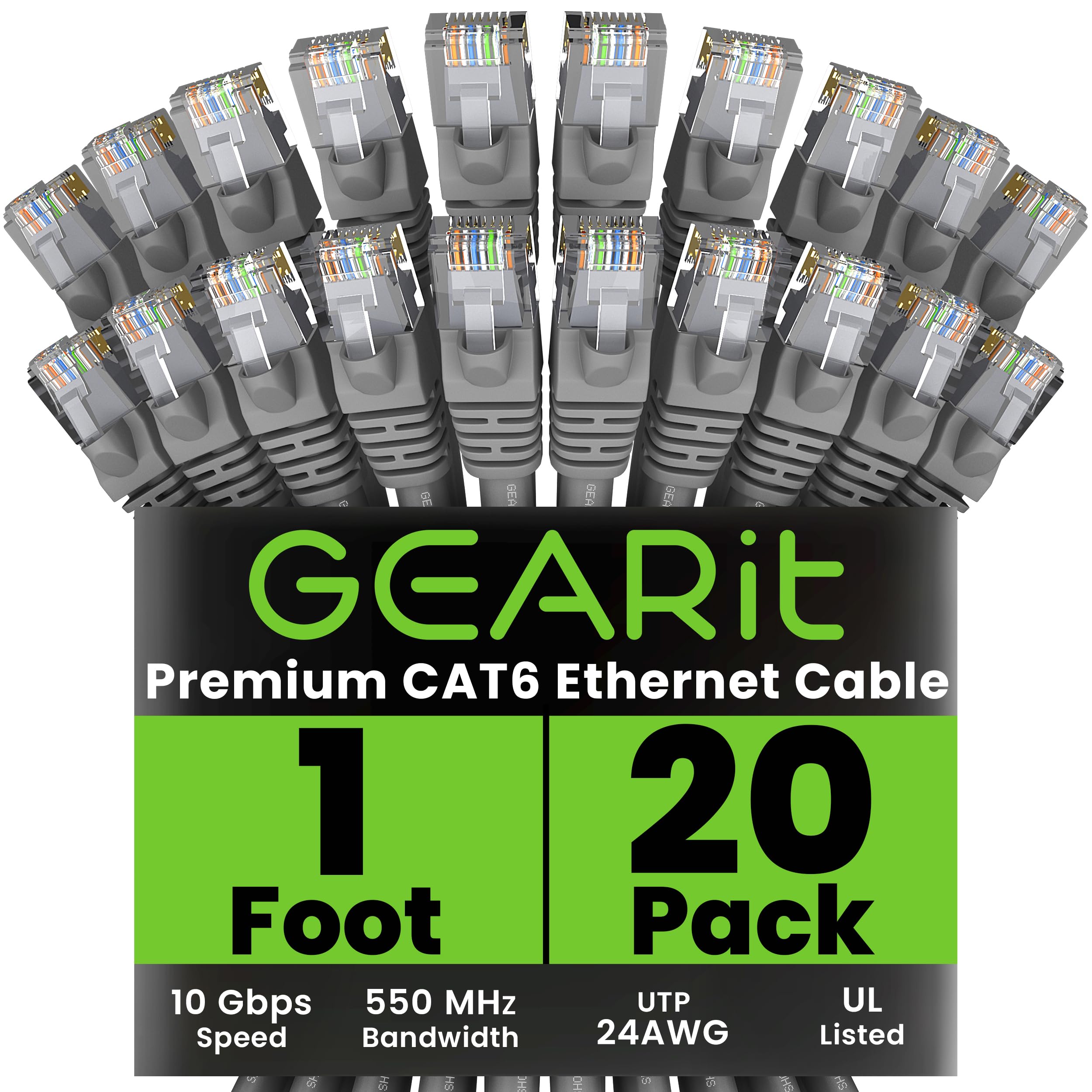 GearIT Cable Ethernet Cat 6 (paquete de 20 unidades de 1 pie), parche de red Cat6, 10 Gbps, RJ45, cable sin enganches, conectores