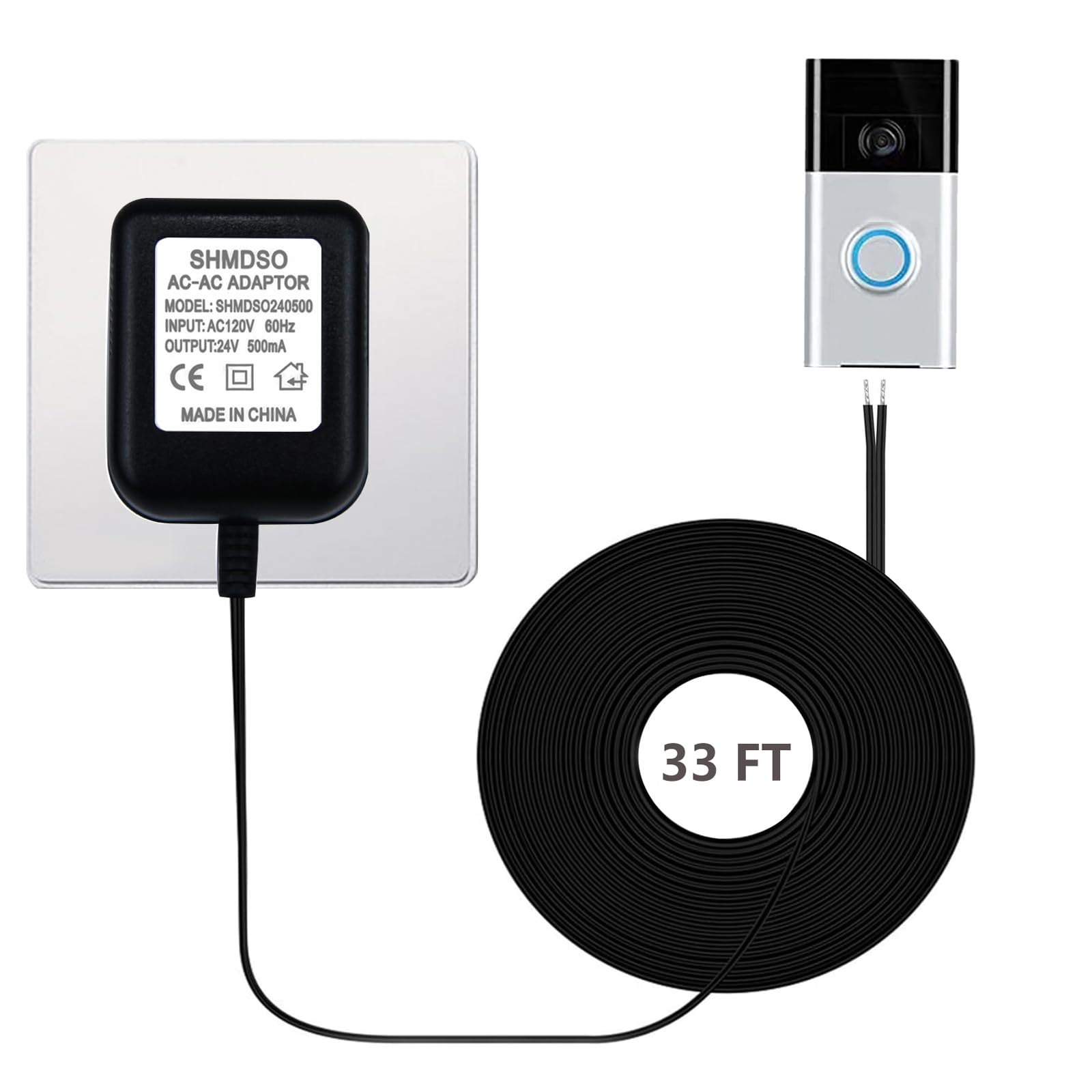 Fuente de alimentación para timbre 24V500MA, cable de salida de 33 pies de longitud, adaptador de timbre de video de 24 voltios, c