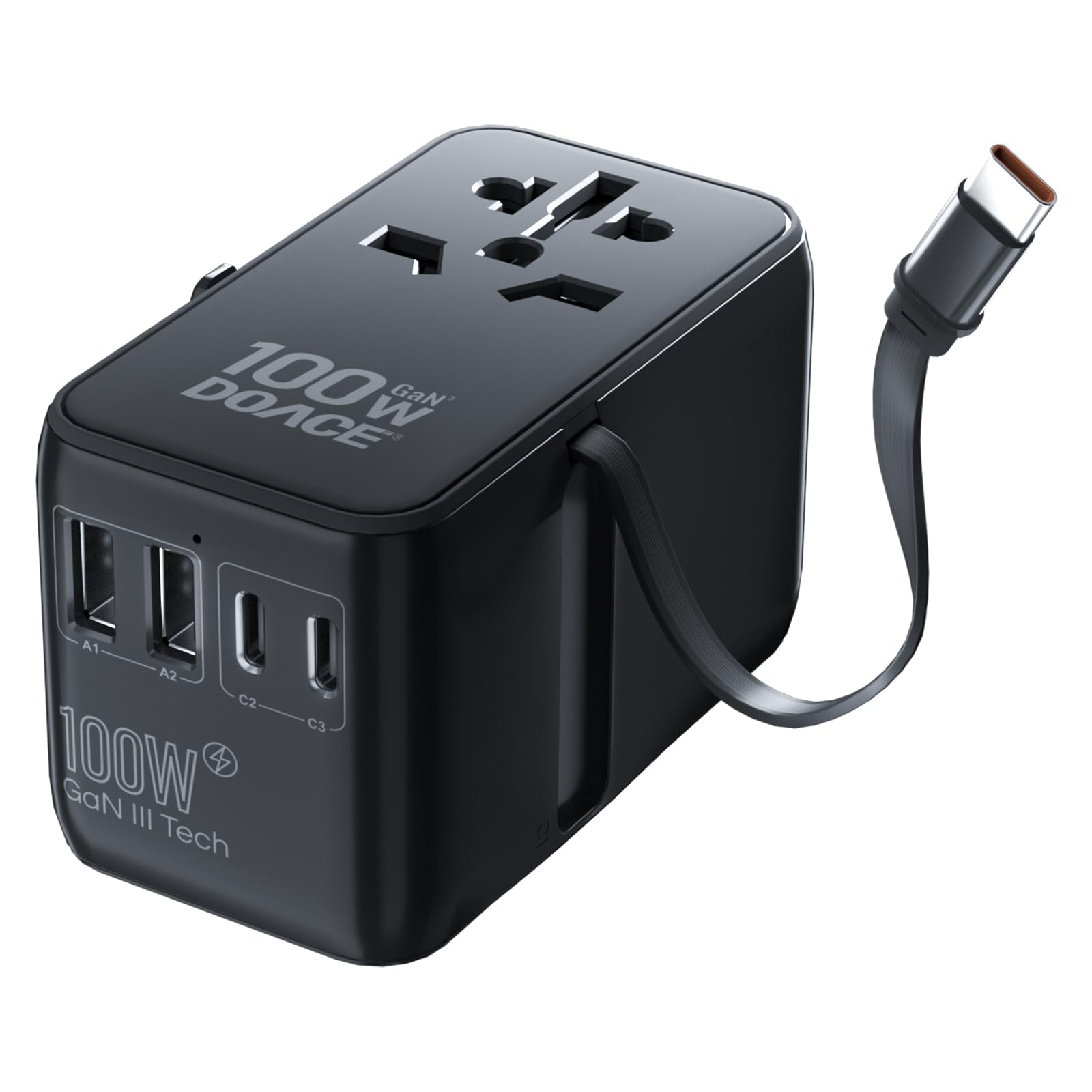 Adaptador de viaje universal, para GaN 100 W, adaptador de corriente internacional integrado, cable tipo c de carga rápida y 4 pue