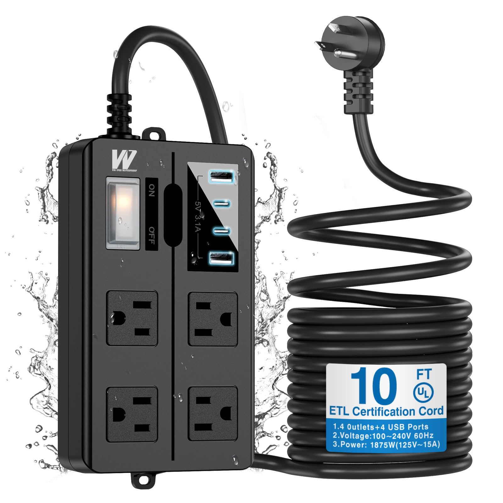 VNJ Regleta de alimentación para exteriores con 4 salidas de CA + 4 puertos USB, protector de sobretensiones impermeable IPX6, dis