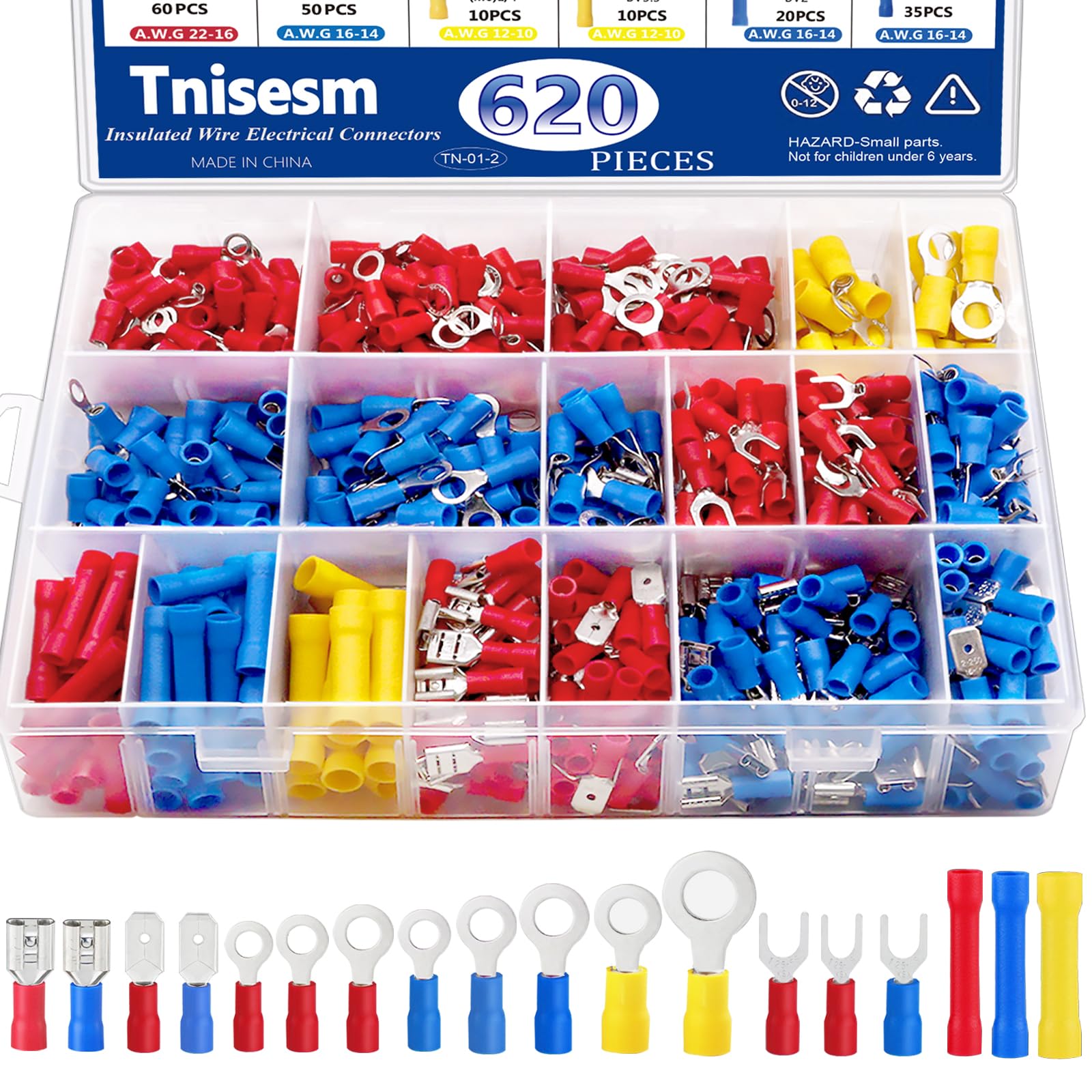 Tnisesm Juego de 620 conectores de crimpado de alambre aislados, juego de terminales de desconexión rápida de horquilla, anillo de